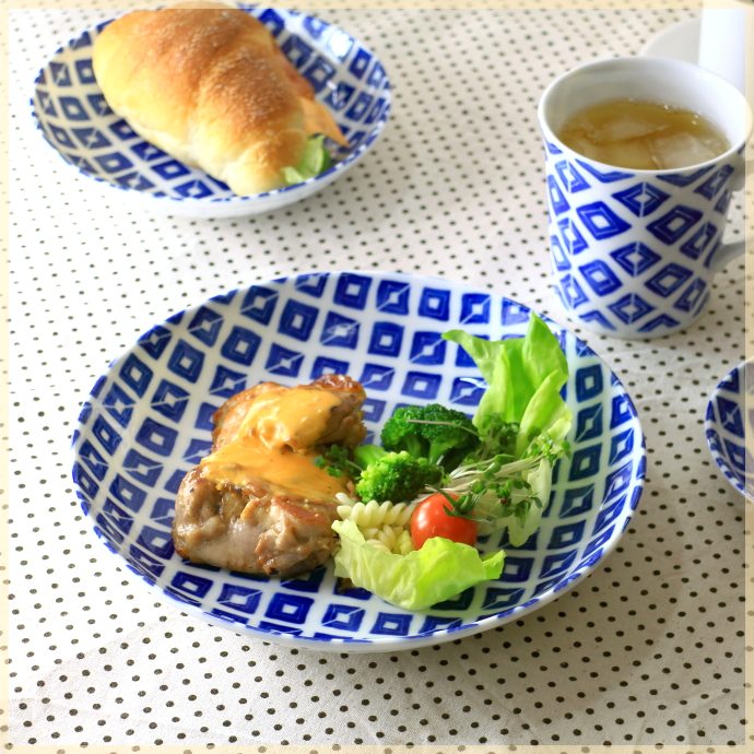 商品説明 白さが美しい白磁器に藍染風の升目模様。 モダンな雰