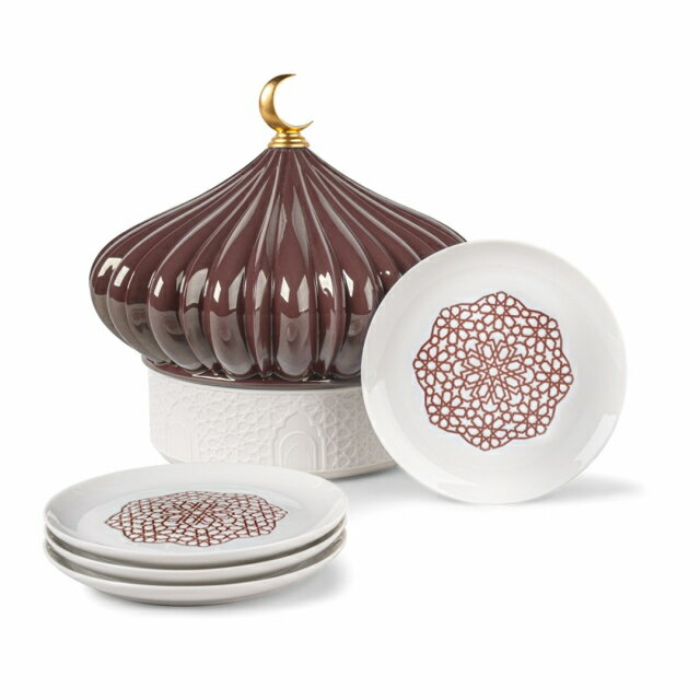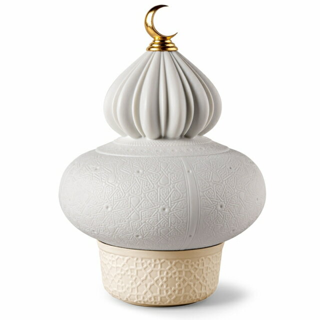 金色の光沢を放つ半透明のマットな白いポーセリンに幾何学模様が