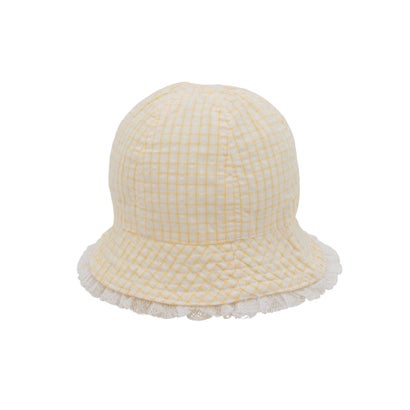 柔らかな色合いのチェック柄が可愛らしいハットです。つば部分に