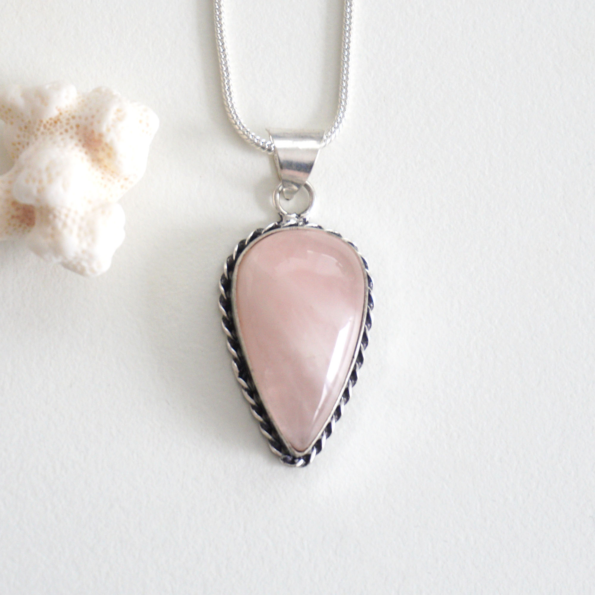 商品説明 シルバーのスネークチェーンのトップに天然石のローズ