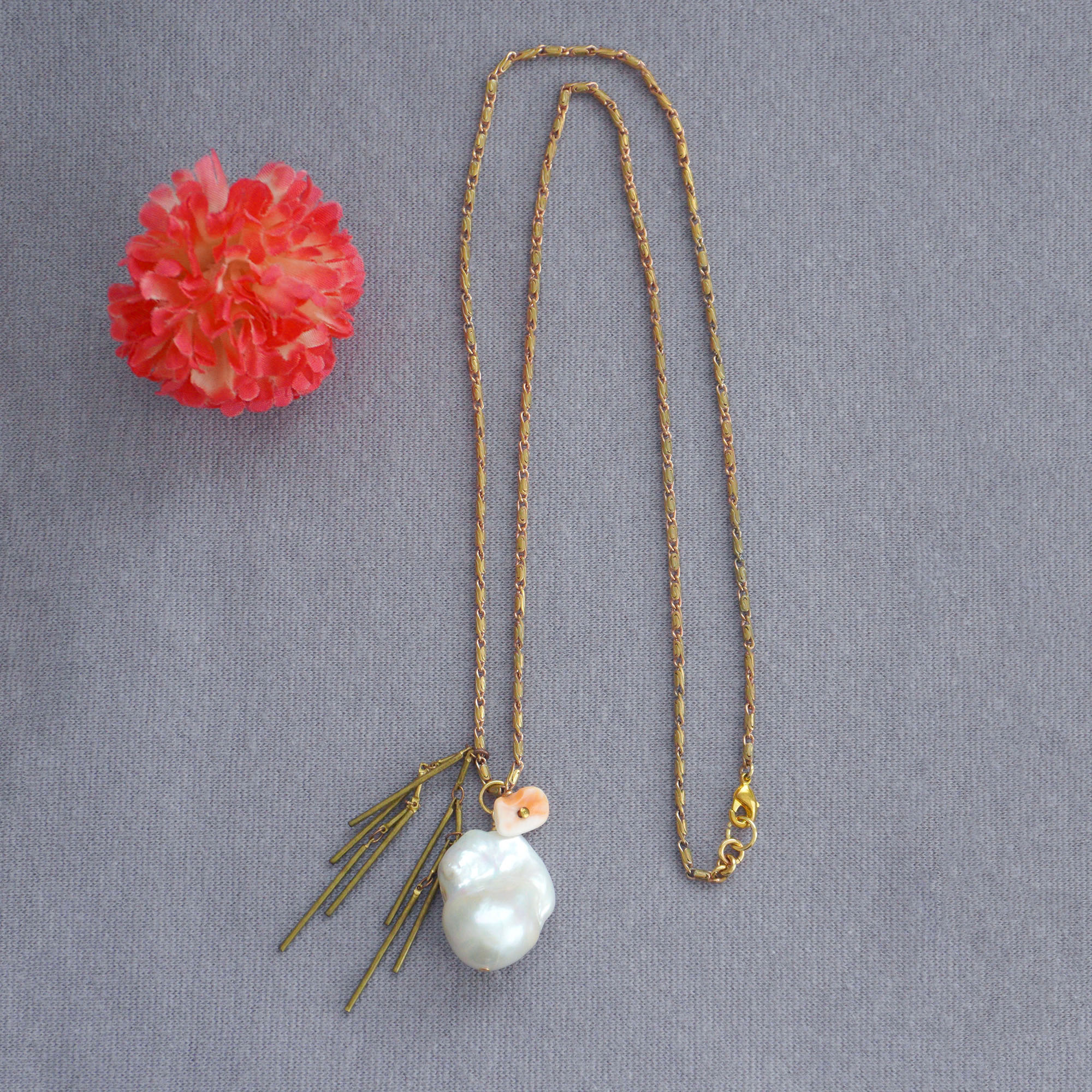 コーラルとシェルの金属フープ ロングネックレス コイン型のコ