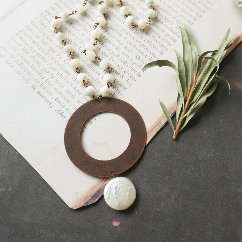 マザーオブパールとコイン型パールの金属フープ ロングネックレ