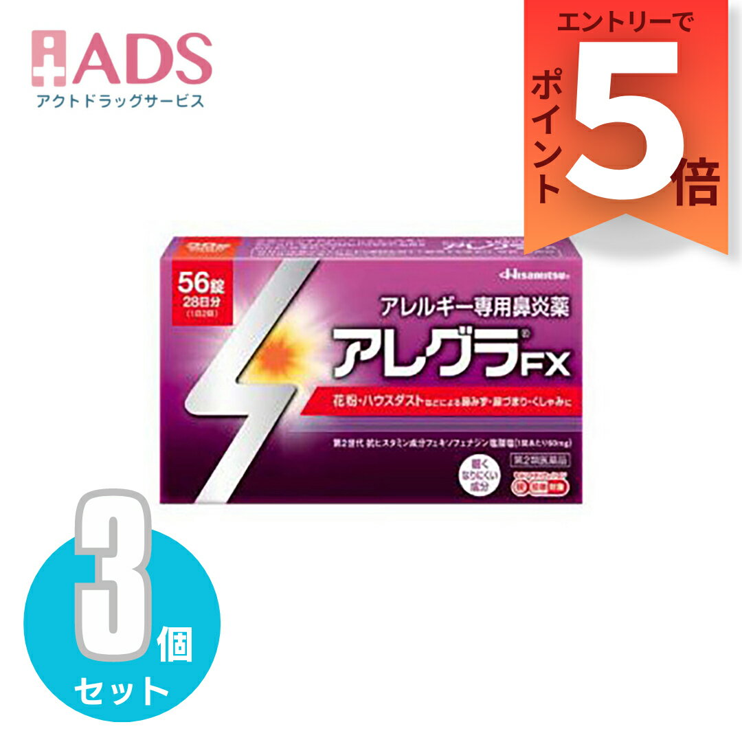 [商品説明]商品情報商品区分一般用医薬品、【第3類医薬品】製品名アレグラFX商品説明文●第2世代抗ヒスタミン成分 フェキソフェナジン塩酸塩が、花粉やハウスダストによる鼻みず、鼻づまり、くしゃみなどのつらいアレルギー症状に優れた効果を発揮します。●脳に影響を及ぼしにくいため、眠くなりにくいアレルギー専用鼻炎薬です。●「集中力、判断力、作業能率の低下」といった、気付きにくい能力ダウン(インペアード・パフォーマンス)も起こしにくいお薬です。●空腹時にも服用できます。●1回1錠、1日2回の服用で、効き目が1日続きます。※花粉などの季節性のアレルギー性鼻炎症状に使用する場合は、花粉飛散予測日から、又は、症状が出始めたら早めに服用を始めると効果的です。使用上の注意■してはいけないこと(守らないと現在の症状が悪化したり、副作用・事故が起こりやすくなります。)1.次の人は服用しないでください。 (1)本剤又は本剤の成分によりアレルギー症状を起こしたことがある人 (2)15才未満の小児2.本剤を服用している間は、次のいずれの医薬品も使用しないでください。 他のアレルギー用薬(皮ふ疾患用薬,鼻炎用内服薬を含む)、抗ヒスタミン剤を含有する内服薬等(かぜ薬、鎮咳去痰薬、乗物酔い薬、催眠鎮静薬等)、制酸剤(水酸化アルミニウム・水酸化マグネシウム含有製剤)、エリスロマイシン3.服用前後は飲酒しないでください。4.授乳中の人は本剤を服用しないか、本剤を服用する場合は授乳を避けてください。 (動物試験で乳汁中への移行が認められています。)■相談すること1.次の人は服用前に医師、薬剤師又は登録販売者に相談してください。 (1)医師の治療を受けている人 (2)アレルギー性鼻炎か、かぜ等他の原因によるものかわからない人 (3)気管支ぜんそく、アトピー性皮ふ炎等の他のアレルギー疾患の診断を受けたことがある人 (4)鼻づまりの症状が強い人 (5)妊婦又は妊娠していると思われる人 (6)高齢者 (7)薬などによりアレルギー症状を起こしたことがある人2.服用後、次の症状があらわれた場合は副作用の可能性があるので、直ちに服用を中止し、この説明文書を持って医師、薬剤師又は登録販売者に相談してください。[関係部位:症状]皮ふ:のど・まぶた・口唇等のはれ、発疹、かゆみ、じんましん、皮ふが赤くなる消化器:はきけ、嘔吐、腹痛、消化不良精神神経系:しびれ感、頭痛、疲労、倦怠感、めまい、不眠、神経過敏、悪夢、睡眠障害泌尿器:頻尿、排尿困難その他:動悸、味覚異常、浮腫、胸痛、呼吸困難、血圧上昇、月経異常まれに次の重篤な症状が起こることがあります。その場合は直ちに医師の診療を受けてください。[症状の名称:症状]ショック(アナフィラキシー):服用後すぐに、皮ふのかゆみ、じんましん、声のかすれ、くしゃみ、のどのかゆみ、息苦しさ、動悸、意識の混濁等があらわれる。肝機能障害:発熱、かゆみ、発疹、黄疸(皮ふや白目が黄色くなる)、褐色尿、全身のだるさ、食欲不振等があらわれる。無顆粒球症、白血球減少、好中球減少:突然の高熱、さむけ、のどの痛み等があらわれる。3.服用後、次の症状があらわれることがあるので、このような症状の持続又は増強がみられた場合には、服用を中止し、医師、薬剤師又は登録販売者に相談してください。 口のかわき、便秘、下痢、眠気成分・分量2錠中成分・分量フェキソフェナジン塩酸塩120mg 効能・効果花粉、ハウスダスト(室内塵)などによる次のような鼻のアレルギー症状の緩和:くしゃみ、鼻水、鼻づまり保管及び取り扱い上の注意(1)直射日光の当たらない湿気の少ない涼しい所に保管してください。(2)小児の手の届かない所に保管してください。(3)他の容器に入れ替えないでください。(誤用の原因になったり、品質が変わることがあります。)(4)使用期限をすぎた製品は使用しないでください。お問い合わせ先会社名:久光製薬株式会社問い合わせ先:久光製薬お客様相談室電話:0120-133250受付時間:9:00 - 17:50(土日・祝日・会社休日を除く)製造販売元日本製サノフィ株式会社〒163-1488 東京都新宿区西新宿三丁目20番2号広告文責ADS06-6748-7755【第2類医薬品】 アレグラFX 久光製薬 28日分 56錠 X 3個セット】 アレルギー専用鼻炎薬 アレグラ 鼻水 花粉 ハウスダスト送料無料】 鼻みず!鼻づまり!くしゃみに!フェキソフェナジン塩酸塩配合のアレルギー専用鼻炎薬「しっかり効く」のに「眠くなりにくい」アレルギー専用鼻炎薬 5つの強み強み11日2回で24時間 しっかり効く強み2眠くなりにくい強み3集中力が低下しにくい強み4口が渇きにくい強み5空腹時にも飲める 2