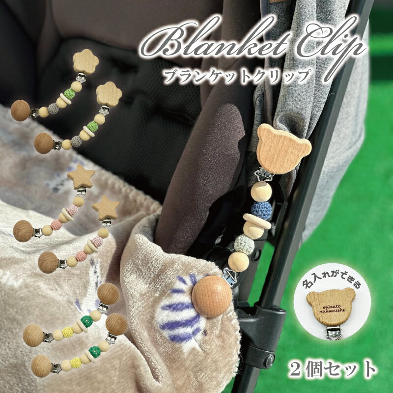 [キャッチコピー]お名前刻印ができる お出かけに便利なウッドビーズのブランケットクリップ 2個セット ブランケットやタオルケットがずり落ちるのを防ぎます。