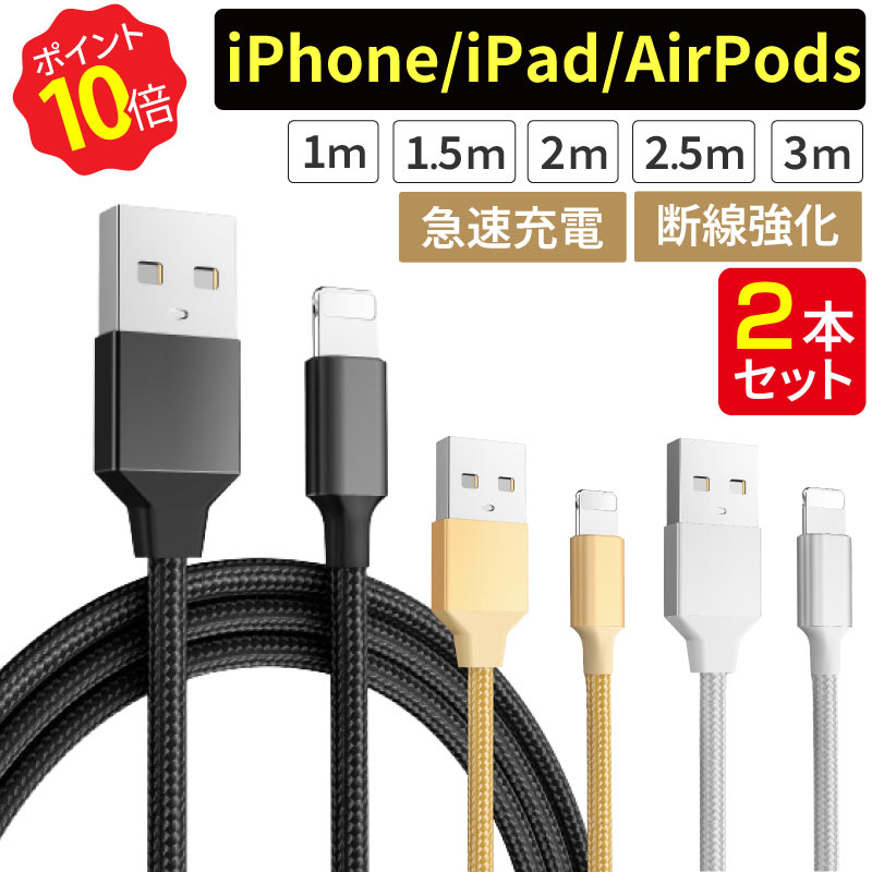 [商品名称]【ポイント10倍★クーポン有り】 充電ケーブル [2本セット] ライトニングケーブル iPhone充電ケーブル 1m 1.5m 2m 2.5m 3m iPhone iPad AirPods iPod 急速充電ケーブル 高速データ転送 充電器 充電コード iPhoneケーブル lightning 安心保証 送料無料
