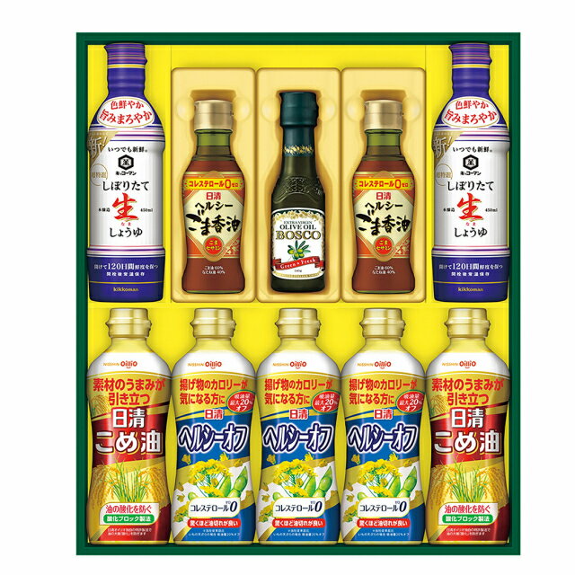 [商品説明]日清オイリオのヘルシーオイル各種とキッコーマンの生しょうゆの詰合せ。調味料ギフトの決定版です。日清オイリオのヘルシーオイル各種とキッコーマンの生しょうゆの詰合せ。 グレードも高い必需品で貰って嬉しい内容です。■仕様・セット内容:●こめ油350g×2、ヘルシーオフ350g×3、ボスコエキストラバージンオリーブオイル140g×1、ヘルシーごま香油145g×2、しぼりたて丸大豆生しょうゆ450ml×2・賞味期限:540日・特定原材料:小麦・箱サイズ:約:37.8×44.5×7.4cmご注文時の注意点です。必ずご確認ください。■「お歳暮のし」をご選択いただいた場合は、11月25日(金)から順次発送します。 ■ご希望のお届け日がある場合は、「配達希望日」にて入力をお願い致します。■こちらは食品・飲料ですので、お客様のご事情での返品はお受けいたしかねます。■長期ご不在やご転居などのご理由により、お受け取りが頂けない場合、衛生上の理由により返送となりますが、再送・ご返金等は致しかねます。■こちらの商品は、代金引換のお支払方法がお受けできません。【発送完了ご報告メールについて】お申込みの集中や出荷元の稼働日などにより「発送完了ご報告メール」の配信が、出荷日以降やお届け完了後となってしまう場合がございます。