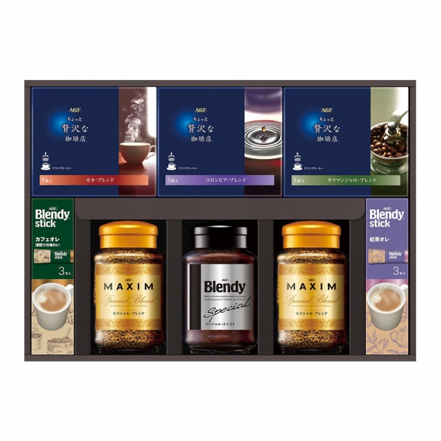 [商品説明]一年の感謝を込めて、「美味しい」を贈りませんか。香りを楽しむ「ちょっと贅沢な珈琲店」ドリップコーヒーや、クリーミーなカフェオレが楽しめる「ブレンディ」スティックなど色々なメニューが楽しめる、AGFおすすめを揃えたギフトセットです。■仕様・セット内容:●ちょっと贅沢な珈琲店ドリップコーヒー(モカブレンド・コロンビアブレンド・キリマンジャロブレンド各5P)、マキシムインスタントコーヒー(スペシャル・ブレンド65g×2)、ブレンディインスタントコーヒー(スペシャル・テイスト70g)、ブレンディスティック(カフェオレ・紅茶オレ各3P)・賞味期限:480日・特定原材料:乳成分・箱サイズ:約:40.6×28.7×6.9cmご注文時の注意点です。必ずご確認ください。■「お歳暮のし」をご選択いただいた場合は、11月25日(金)から順次発送します。 ■ご希望のお届け日がある場合は、「配達希望日」にて入力をお願い致します。■こちらは食品・飲料ですので、お客様のご事情での返品はお受けいたしかねます。■長期ご不在やご転居などのご理由により、お受け取りが頂けない場合、衛生上の理由により返送となりますが、再送・ご返金等は致しかねます。■こちらの商品は、代金引換のお支払方法がお受けできません。【発送完了ご報告メールについて】お申込みの集中や出荷元の稼働日などにより「発送完了ご報告メール」の配信が、出荷日以降やお届け完了後となってしまう場合がございます。