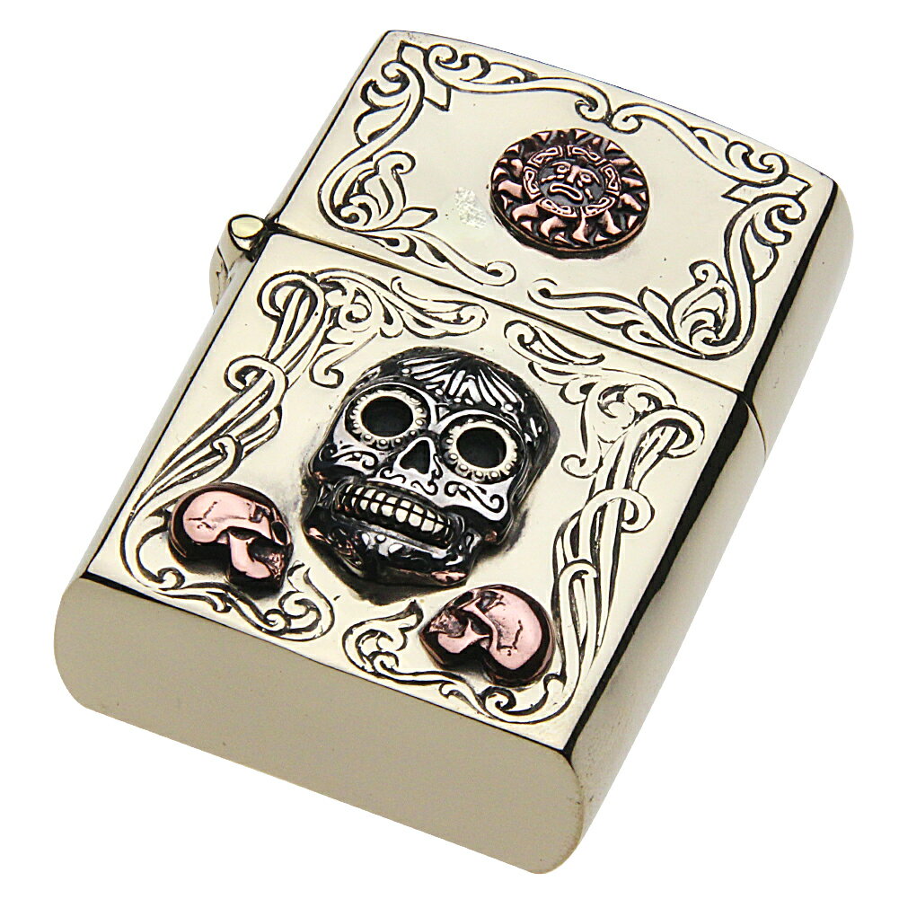 [商品説明]メキシカンスカルオイルライター s0027 縦58mm × 横40mm × 幅18mm メキシカンスカルに代表されるラテンのデザインが魅力的な真鍮ケースのオイルライターです。見事な彫金やシルバーや銅など素材の使い分けなど随所にコダワリを感じるアイテムです。中にセットしたライター部分にはお馴染みのZIPPO(ジッポ)社製の物を使用しています。 【素材:シルバー925(スターリングシルバー) 真鍮(ブラス) 銅】