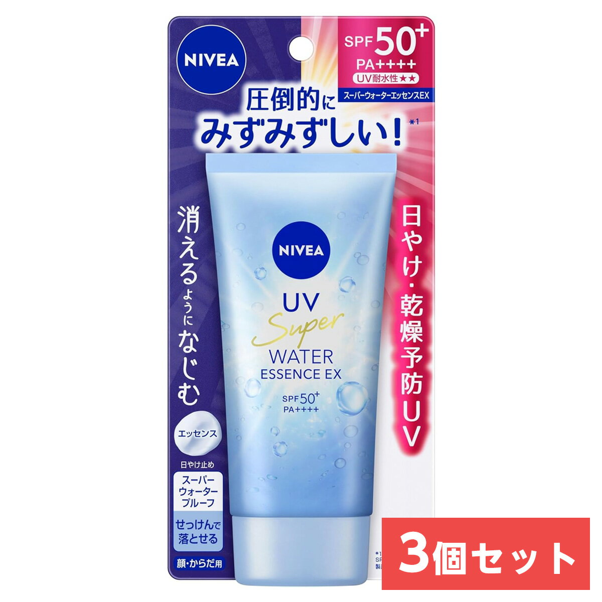 [商品説明]日やけ・乾燥予防UV。SPF50+/PA++++ ・日やけ・乾燥予防UV ・強烈紫外線から素肌をしっかりまもる SPF50+/PA++++/UV耐水性★★ ・海・プール・スポーツ・レジャー・強い日差しの外出時にもおすすめ。 ・肌にうるおいを与えて透明感あふれる素肌へ ・圧倒的にみずみずしい使い心地*1。 みずみずしいエッセンスが顔の細かいパーツにもフィットし、消えるようにムラなくなじむ。 肌と一体化するような軽さで、べたつきが気にならない素肌っぽい快適なつけ心地。 ・スーパーウォータープルーフ ・汗・水に強く落ちにくい ・せっけんで落とせる(専用クレンジング不要) ・顔・からだ用。 化粧下地に使える ・鉱物油フリー・合成着色剤フリー・パラベンフリー・パウダーフリー ・優しいほのかなフローラルアロマの香り *1 ニベアUVシリーズSPF50+/PA++++製品内における使用感《製品仕様》●容量:80g×3 ●成分・素材:成分:水、エタノール、メトキシケイヒ酸エチルヘキシル、PG、ジエチルアミノヒドロキシベンゾイル安息香酸ヘキシル、セバシン酸ジイソプロピル、パルミチン酸イソプロピル、エチルヘキシルトリアゾン、トレハロース、マンニトール、加水分解ヒアルロン酸、センチフォリアバラ花水、BG、ジステアリン酸ポリグリセリル-3メチルグルコース、ジラウラミドグルタミドリシンNa、ビスエチルヘキシルオキシフェノールメトキシフェニルトリアジン、(アクリレーツ/アクリル酸アルキル(C10-30))クロスポリマー、ヒドロキシプロピルメチルセルロースステアロキシエーテル、カプリリルメチコン、フェノキシエタノール、水酸化Na、BHT、香料 ●香り・色・味: ・合成着色剤フリー ・優しいほのかなフローラルアロマの香り【ご購入前にご確認ください】※沖縄・離島、その他一部地域からのご注文はお受けできません。システムの都合上ご注文は可能ですが、自動キャンセルになりますのでご了承ください。※当店ではのし・ラッピング梱包は承っておりません。※お客様都合でのキャンセル及び返品・交換は受け付けておりません。あらかじめご了承の上、ご注文ください。※商品の仕様・パッケージや原産国・原産地などは、メーカーの都合により予告なく変更される場合がございます。最新の情報につきましては、メーカーにご確認くださいますようお願いいたします。