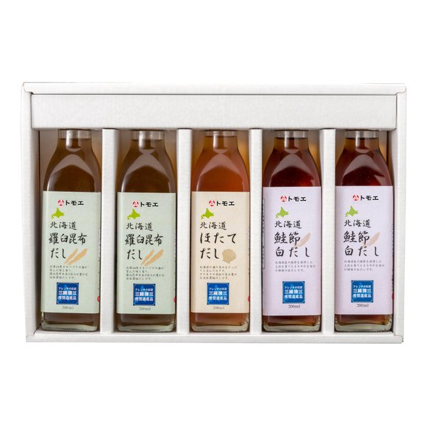 [商品説明]●北海道の海の恵みをたっぷり含んだ『羅臼昆布』『ほたて』の濃縮だしと、『鮭節』のうま味が広がる白だし。●様々なお料理に使用でき、簡単に本格的なおいしさをお楽しみいただけます。■内容 三國推奨北海道羅臼昆布だし・三國推奨北海道鮭節白だし/各200ml×2 三國推奨北海道ほたてだし/200ml■原材料 〇三國推奨北海道羅臼昆布だし:昆布エキス(国内製造)、食塩、酒精、昆布(北海道羅臼産100%)/調味料(アミノ酸等)、増粘多糖類 〇三國推奨北海道鮭節白だし:たん白加水分解物(北海道製造)、発酵調味料、食塩、還元水飴、砂糖、しょうゆ(小麦・大豆を含む)、醸造酢、さけ削りぶし、鮭節エキス、酵母エキス/調味料(アミノ酸等)、酒精 〇三國推奨北海道ほたてだし:ホタテエキス(北海道製造)、水飴、食塩、酒精/調味料(アミノ酸等)■温度帯:常温■賞味期限:製造日よ300日