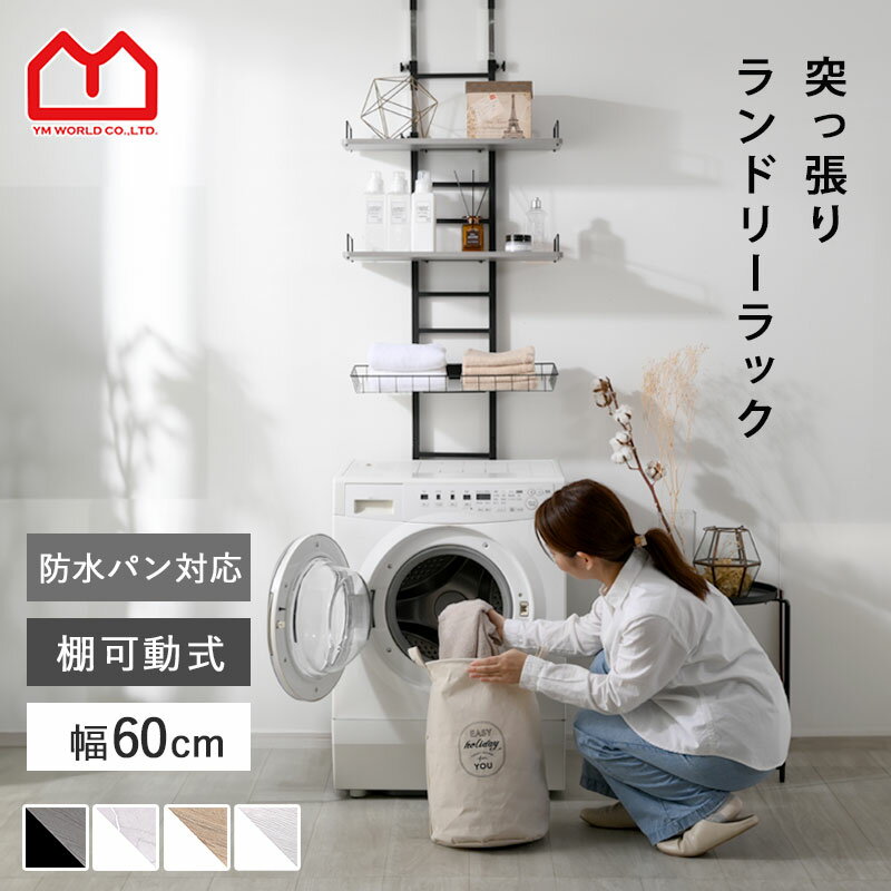 [キャッチコピー]つっぱり ランドリーラック 幅60 3段 バスケット付 防水パン対応 伸縮 棚 洗濯機 突っ張り ラック スリム おしゃれ ランドリー収納 引っ掛け カゴ付き 防水パン フチ またげる 洗面所
