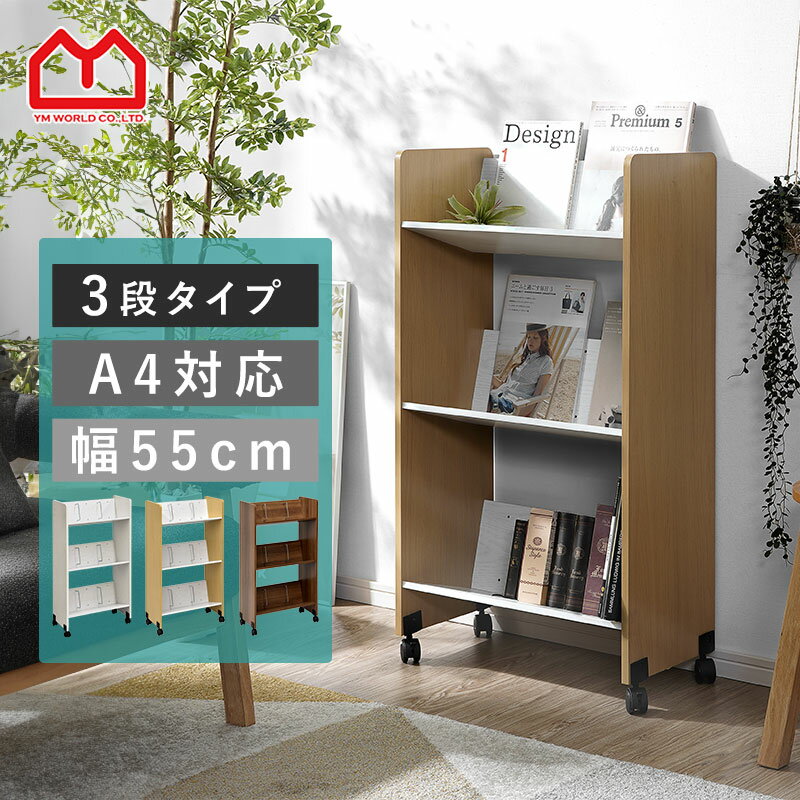 [商品名称]ファイルワゴン 3段 斜め 本棚 キャスター付き キャスター サイドワゴン スリム ワゴン ファイル収納 書類 低い デスク a4 薄型 オフィス サイド 移動 木製 おしゃれ マガジンラック ビジネス 絵本 業務用 ワイド 棚 a4サイズ 雑誌 収納 ボックス 収納棚 教科書 組み立て