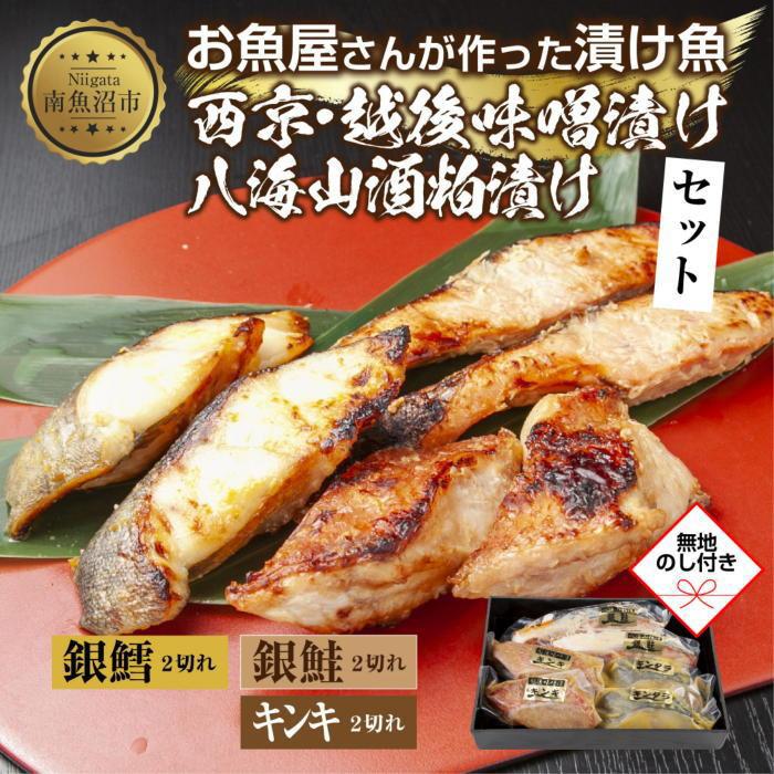 [商品名称]【ふるさと納税】14.無地熨斗 漬け魚 銀鮭 八海山 粕漬け 銀鱈 西京漬け キンキ 味噌漬け 切り身 3種 計6切れ 漬魚 鮭 鱈 きんき キチジ 西京焼き 西京味噌 越後味噌 酒粕漬け 酒粕 利七屋 新潟県 南魚沼市