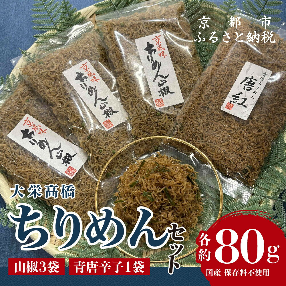 [商品名称]【ふるさと納税】【大栄高橋商店】ちりめん セット (山椒3袋、青唐辛子1袋)[ 京都 ちりめん山椒 老舗 こだわり 大容量 小分け 高評価 人気 おすすめ グルメ お取り寄せ 通販 ちりめんじゃこ 送料無料ふるさと納税 ]