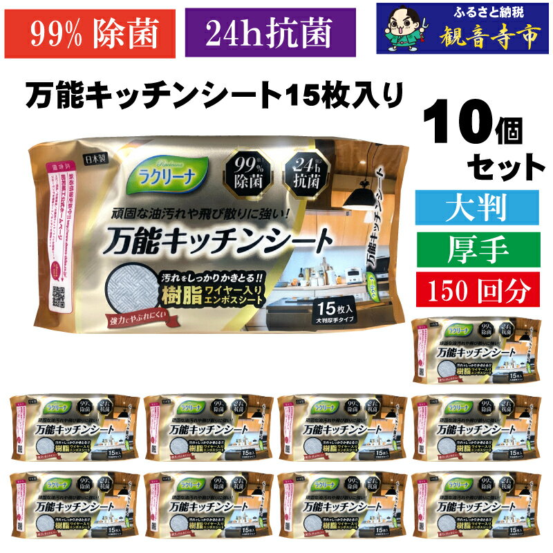 [商品名称]【ふるさと納税】【99%除菌・24時間抗菌】万能キッチンシート15枚入り 10個セット(150回分)KA-126F お届け:ご寄附(入金)確認後、2週間で順次出荷いたします。