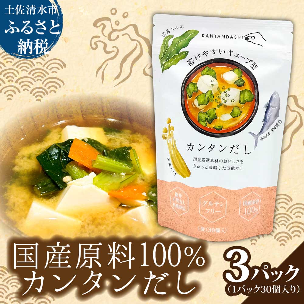 [商品名称]【ふるさと納税】カンタンだし 3パックセット 1パック4g×30個入り 宗田鰹節 キューブ 溶けやすい 出汁 ダシ 調味料 和食 和風 味噌汁 炊き込みご飯 煮物 料理 簡単 時短 国産 高知県 高知 ふるさとのうぜい 土佐清水 9000円【R01454】