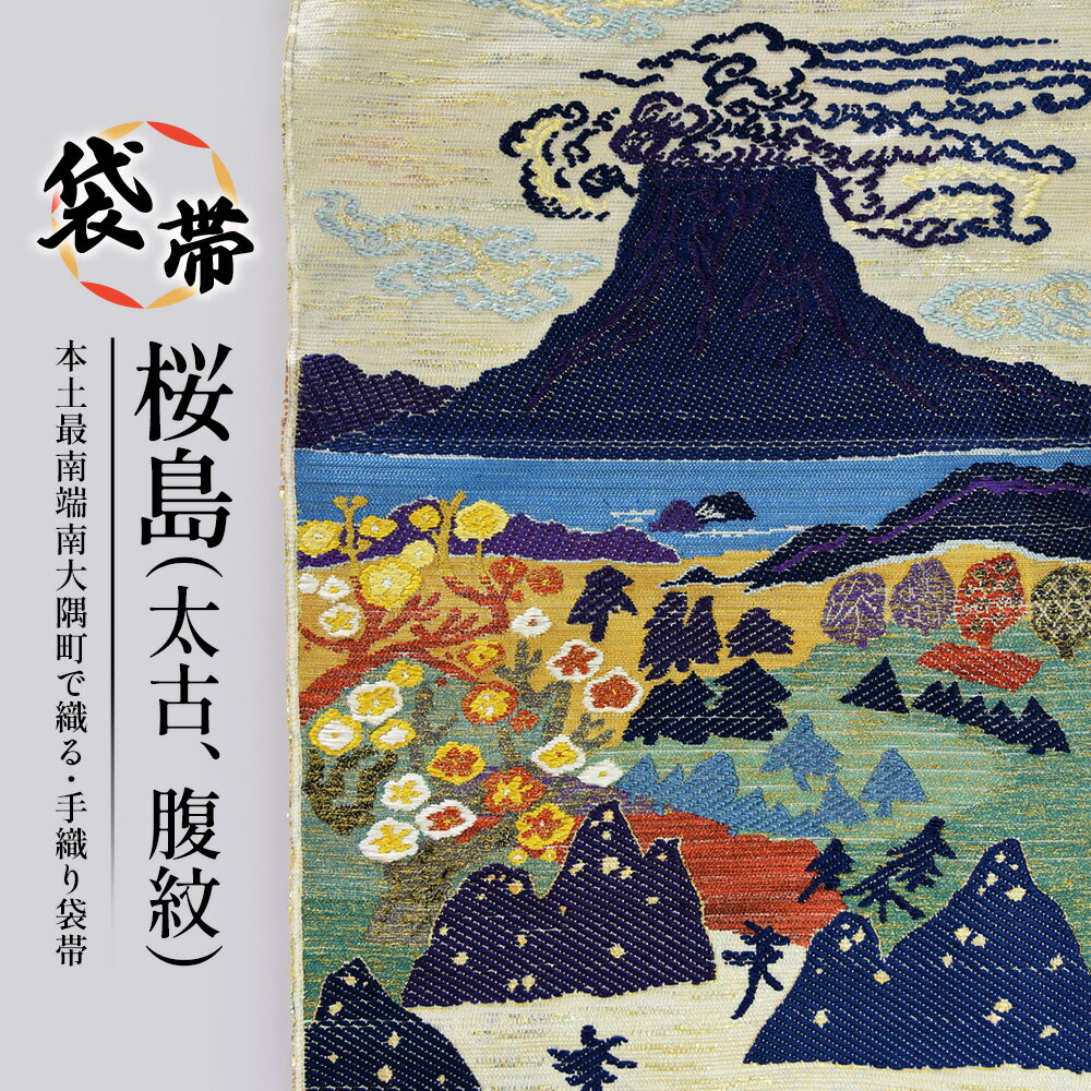 [キャッチコピー]南大隅町 ふるさと納税 織匠 神宮司鹿児島の象徴・桜島をモチーフに、太鼓と腹紋の意匠を織り込んだ特別な袋帯