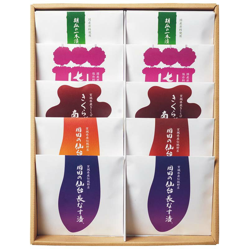 [商品説明][内容]岡田の仙台長なす漬70g×2、仙台長なすのからし漬50g、仙台長なすのみそ漬55g、きくらげの南蛮みそ漬50g×2、七夕漬50g×2、仙台っ子(胡瓜の一本漬)90g×2<宮城県・国内産使用> [賞味・消費期限]常温40日