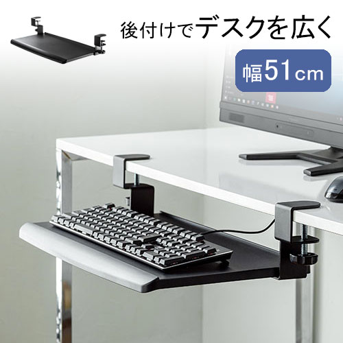 [商品説明]デスクに後付設置できるキーボードスライダー。クランプ式でネジ不要の簡単設置。デスクをキーボードトレー付きにできる後付スライダー。幅50cmでコンパクトキーボードの設置にも最適。エルゴノミクスデザイン。<特長>●既存のデスクにクランプで簡単に取付ができるキーボードスライダーです。※取付の際は干渉物が無いことをご確認ください。●棚部分(有効接地面)は約W51×D20cmあるので、フルキーボードとマウスを置いても余裕がある広さです。●後付でき、ネジが不要で取り付けできるクランプ設置型です。●クランプは厚さ1.5cmから4cmまで対応でき、クランプには傷防止・滑り止め用のクッション付きです。●キーボードとマウス操作を身体の近い位置で行うことができるので、姿勢が前のめりにならず、身体に負担がかからない背筋を伸ばした状態での文字入力が可能です。●キーボードとマウスを机上に置かなくていいので、広々と書類や資料を広げて作業することができます。●キーボードを使用しない時は、スライドして机下に収納することができます。 ※キーボードスライダーに、過度の重量を掛けないでください。<仕様>■サイズ:約W626.5×D295×H128mm■重量:約1.8kg■天板有効サイズ:約W510×D200mm■納品形態:ノックダウン組立式■材質:クランプ/スチール 棚板部/HIPS(ハイインパクトポリスチレン■総耐荷重:10kg■生産国:台湾■保証期間:購入日より6ヶ月■取扱説明書:日本語取扱説明書あり■対応デスク:天板裏に引き出しなどの干渉物が無いフラットな机、木製天板で厚さ15mmから40mmまでの机<関連キーワード>キーボードスライダー デスク 取り付け クランプ フルキーボード マウス 収納 100-KB004 サンワサプライ