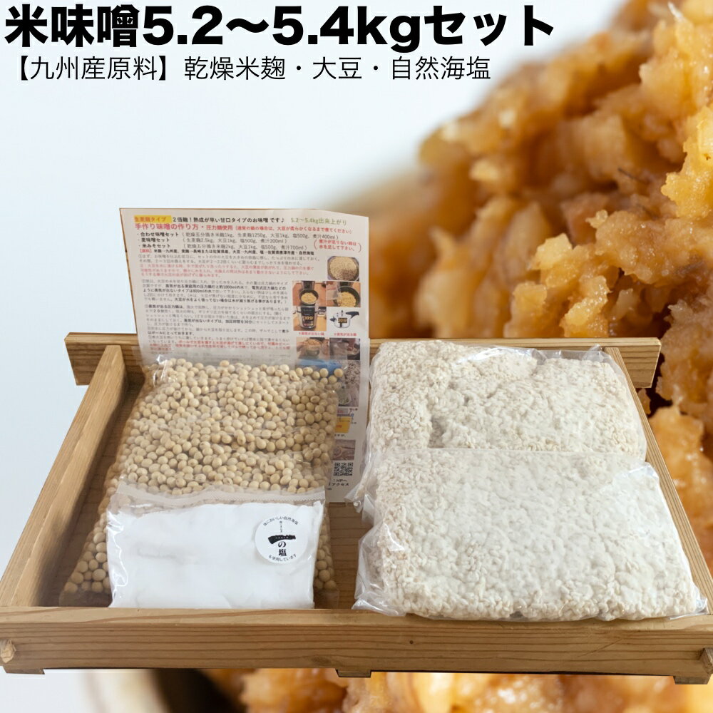 [商品説明]レターパックプラスで配送 2倍麹 甘口 米味噌5.2〜5.4kgセット セット内容(全て九州産) ・乾燥五分搗き米麹2000g(九州産) ・大豆1000g(九州産ふくゆたか) ・食塩500g(佐賀県唐津産の自然海塩・一の塩) 自家製味噌を造ると、お味噌がどうやってできているか良く分かり、食育にもつながります。お子さんと作ってみてはいかがでしょうか? 自分で作ったお味噌は、とってもおいしいですよ(^^) 大豆を炊くときに圧力鍋があればとっても簡単!大豆をやわらかく炊いて、潰し、他の材料と混ぜて樽に詰め、常温で保管します。 丁度良い熟成具合(お好みの味)になったら、冷蔵庫で保管します。 麹が多く、熟成がとても早く甘めで優しい味のお味噌になります。 温かい地域では甘めの若味噌が人気ですので、約2か月は常温で熟成。 寒い地域ではコクのある熟成味噌が人気ですので、約4か月は常温で熟成させると良いです。(保存の気温によりますので、年間通して寒い地域はさらに熟成期間が必要な場合もあります。) おいしく出来たら冷蔵庫で保管します。冷蔵庫では長期間保存でき、その間も低温熟成で美味しくなります。