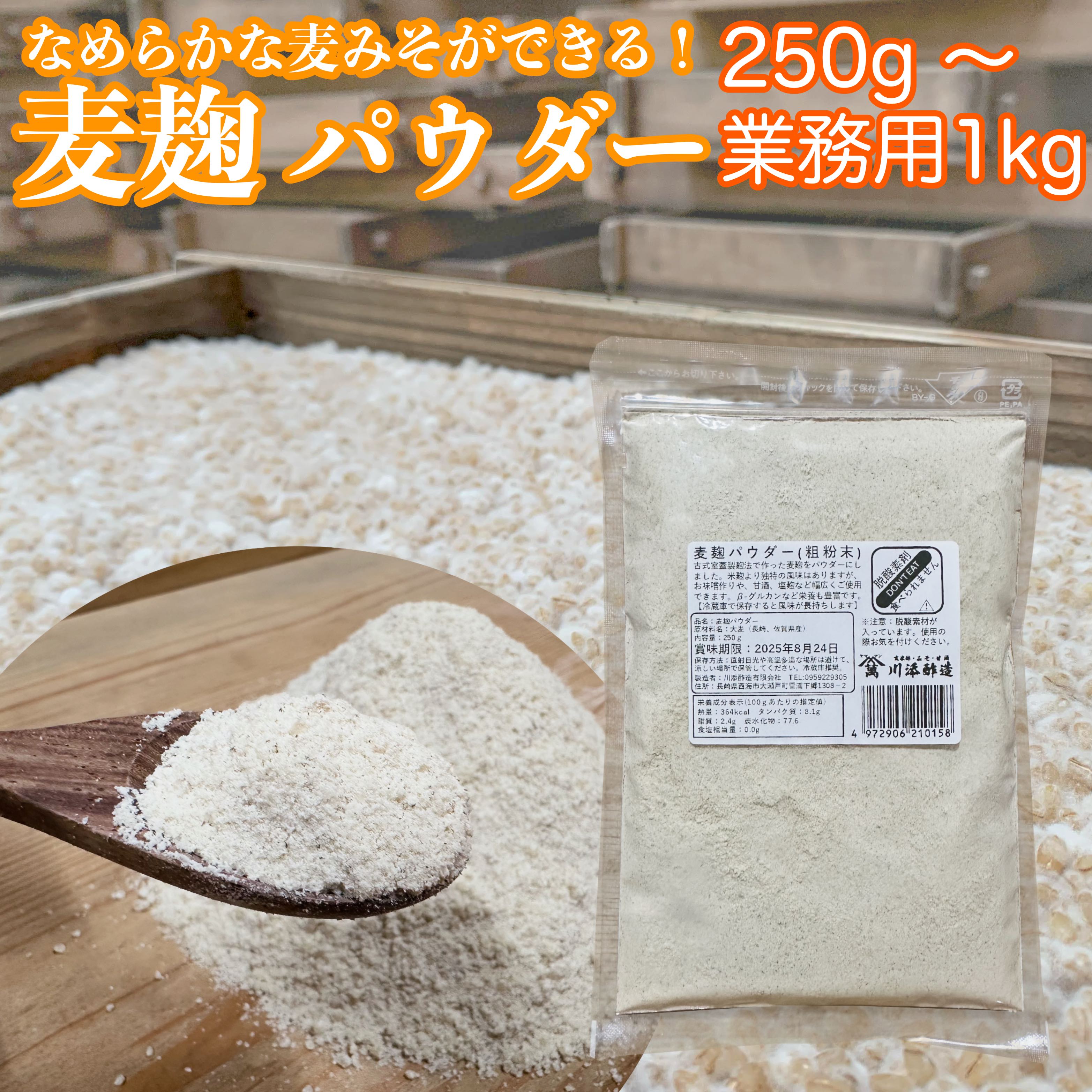 [商品説明]麦麹 パウダー 250g〜1kg業務用 乾燥 麦麹 粗粉末 七分搗き 大麦 使用 麦麹粉 プロテイン に入れて 腸活 消化吸収 サポート 食物繊維 発酵食品 ふりかけ 愛犬 愛猫 麹粉 麹菌 味噌作り 甘酒 醤油麹 麦味噌 合わせ味噌 などに こうじ 酵素 糀 乾燥麦麹を粉末にしました♪ 麦味噌作りでは、出来上がりも早く、必ず残る麦の繊維も粉砕しているため、できたお味噌も味噌漉しに残りません♪ その他、色々な発酵食品にご利用ください。 乾燥麦麹パウダーは、製造に手間がかかるため、なかなか手に入らないですよ☆☆ 安さの秘密は、、1? →企業努力だけです。 ・麹作りから加工まで全て自社で手作りです(小型の機械はあり) ・パッケージ、デザイン費、広告費をかけず、麹造りに全集中! ・店舗直販のお客様と、オンラインショップのお客様を区別しない価格。顔が見えなくても対面販売の気持ちです。 ・なにより、続ける事が出来て、気軽に購入出来ないと心が健康でいられません。なので、あまり市場価格に左右されません。 ・ここだけの話、昔から営業マンはいない、全員造り手で隙間時間にオンラインショップも手作りで運営している、商売が下手な会社なんです。。 乾燥麦麹のラインナップはこちら! ・乾燥麦麹 250g×2個 (合計500g)・乾燥麦麹 250g×3個 (合計750g)・乾燥麦麹 250g×4個 (合計1000g)・乾燥麦麹 750g・乾燥麦麹 1000g・乾燥麦麹 1000g×2個 (合計2kg)・乾燥麦麹 業務用5kg ☆人気!!お味噌作りセットもあります☆ 川添酢造の味噌作りセットはこちら 重要:乾燥麦麹に関するよくあるお問い合わせ(粒タイプの場合) ・「白いカビのようなものが生えている」「ふわふわした綿毛のようなものがある」「白いカビが生えて固まっている」 →この白いカビは、麹菌ですのでご安心ください。 麹が出来上がった時は、麹菌で固まっており、それをバラバラにほぐして出荷しています。 その時麹菌はあまり見えなくなりますが、麹菌は生きていますので保管中にも増えて真っ白になったり、固まったりします。 品質には問題有りませんのでご安心ください。また、真っ白になっていなくても麹菌が出した酵素があれば良いのでご安心ください。 川添酢造の麦麹は、長崎県もしくは佐賀県産の七分搗き胚芽大麦を蒸し、床に広げ冷まし、麹菌をまき、昔ながらの室(むろ)と室蓋(もろぶた)を使って手作業で作っております。完成した生麹を二日間乾燥させて、約30〜35%の水分を減らしています。乾燥させる際に、麹菌が麦の中心部に向かって菌糸を伸ばし、生麹よりもさらに麹菌がハゼこんでいます。生麦麹は冷蔵庫で1週間〜2週間で使い切ってしまわないといけませんが、乾燥麦麹は常温で長期間保存できます。冷蔵庫であればそれ以上の保存が可能です。商品名:麦麹パウダー250g内容量:250g賞味期限:約5ヶ月 保存方法:常温(可能ならば冷蔵庫推奨)麦麹 パウダー 250g〜1kg業務用 乾燥 麦麹 粗粉末 七分搗き 大麦 使用 麦麹粉 プロテイン に入れて 腸活 消化吸収 サポート 食物繊維 発酵食品 ふりかけ 愛犬 愛猫 麹粉 麹菌 味噌作り 甘酒 醤油麹 麦味噌 合わせ味噌 などに こうじ 酵素 糀