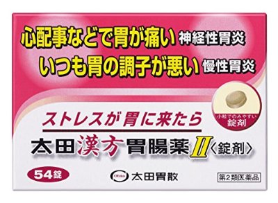 商品価格:862円 レビュー件数:0 レビュー平均:0 店舗名: 健康エクスプレスジャンルID: 553364< 購入ページを表示> [商品名称]【第2類医薬品】太田漢方胃腸薬II 錠剤 54錠[キャッチコピー]【第2類医薬品】太田漢方胃腸薬II 錠剤 54錠 [商品説明]使用上の注意 ●相談すること 1.次の人は服用前に医師又は薬剤師に相談してください (1)医師の治療を受けている人。 (2)妊婦又は妊娠していると思われる人。 (3)今までに薬により発疹・発赤、かゆみ等を起こしたことがある人。 2.次の場合は、直ちに服用を中止し、この説明書を持って医師又は薬剤師に相談してください (1)服用後、次の症状があらわれた場合 関係部位 症状 皮ふ 発疹・発赤、かゆみ (2)1ヶ月位服用しても症状がよくならない場合 効果・効能 体力中等度以下で、腹部は力がなくて、神経過敏で胃痛又は腹痛があって、ときに胸やけや、げっぷ、胃もたれ、食欲不振、はきけ、嘔吐などを伴うものの次の諸症:神経性胃炎、慢性胃炎、胃腸虚弱 *神経性胃炎とは飲みすぎや食べすぎでもないのに胃の調子がおかしいという時は、ストレスによる場合が多いようです。ストレスが自律神経の失調をおこし、胃の働きが異常となり、胃痛、食欲不振、はきけなどの症状としてあらわれます。これを神経性胃炎といいます。 用法・用量 次の量を食間(就寝前を含む)又は空腹時に服用してください。 年齢 1回量 1日服用回数 成人(15歳以上) 3錠 3回 7-14歳 2錠 7歳未満 服用しないこと *食間とは食後2-3時間のことをいいます。 (用法・用量に関連する注意) 小児に服用させる場合には、保護者の指導監督のもとに服用させてください。 成分・分量 1日量(9錠)中 ●安中散加茯苓末・・・2100mg (下記生薬の混合末)・・・2100mg ブクリョウ(茯苓)・・・500mg ケイヒ(桂皮)・・・300mg エンゴサク(延胡索)・・・300mg ボレイ(牡蛎)・・・300mg ウイキョウ(茴香)・・・200mg シュクシャ(縮砂)・・・200mg カンゾウ(甘草)・・・200mg リョウキョウ(良姜)・・・100mg ●安中散料加茯苓エキス・・・270mg (下記生薬のエキス)ブクリョウ(茯苓)・・・810mg ケイヒ(桂皮)・・・486mg エンゴサク(延胡索)・・・486mg ボレイ(牡蛎)・・・486mg ウイキョウ(茴香)・・・324mg シュクシャ(縮砂)・・・324mg カンゾウ(甘草)・・・324mg リョウキョウ(良姜)・・・162mg (添加物)ヒドロキシプロピルセルロース、ヒドロタルサイト、メタケイ酸アルミン酸マグネシウム、ステアリン酸マグネシウム、セルロース 保管及び取扱い上の注意 (1)直射日光の当たらない湿気の少ない涼しい所に保管してください。 (2)小児の手の届かない所に保管してください。 (3)他の容器に入れ替えないでください。(誤用の原因になったり品質が変わることがあります。) (4)使用期限を過ぎた製品は服用しないでください。 製造元 株式会社 太田胃散 「お客様相談係」 電話(03)3944-1311(代表) 受付時間/9:00-17:00(土・日・祝日を除く) 製造・発売元 株式会社 太田胃散 東京都文京区千石2-3-2 リスク区分 第2類医薬品 広告文責 株式会社ケンコーエクスプレス 薬剤師:岩崎喜代美 TEL:03-6411-5513自律神経の乱れからくる神経性胃炎や、慢性胃炎を改善する胃腸薬です ●悩み、不安、緊張、ストレスなどで胃の働きを調整する自律神経が乱れると胃の働きも乱れ、胃痛、食欲不振、はきけなどの症状を起こすことがあります。 ●漢方処方の安中散に茯苓(ブクリョウ)を加えることで、効きめを強化し、胃の機能低下にすぐれた効果をあらわします。 ●心配事などで胃が痛い、いつも胃の調子が悪い、人間関係にお悩みの方、仕事で神経を多く使う方、生活が不規則、神経質な方に小粒で飲みやすい錠剤タイプ。 ●医薬品。 ●初回購入の場合や不明点がある場合は購入前に薬剤師に相談してください。 < 購入ページを表示>