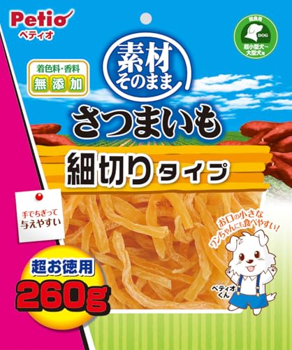 商品価格:823円 レビュー件数:0 レビュー平均:0 店舗名: kichibeiジャンルID: 112779< 購入ページを表示> [商品名称]ペティオ (Petio) 素材そのまま さつまいも 細切りタイプ 260g[商品説明]細切り細切り/260g/-・Size:260gStyle:細切り・パッケージ個数:1・ほっこり甘いさつまいもをそのまま使用。手でちぎって与えやすい細切りタイプ。商品紹介 食物センイやビタミンC・Eを含むさつまいも。蒸してから乾燥しているので糖度がUPし甘みが濃縮されています。着色料・香料 無添加。 原材料・成分 さつまいも 使用方法 ※愛犬の健康状態、年齢、運動量を考慮したうえで別記の給与量を目安に1日1~2回に分けてお与えください。※愛犬の食べ方や習性によっては、小さく切ってお与えください。●本商品は犬用で、間食用です。主食として与えないでください。●消化器官が未発達な1歳未満の幼犬や、のどに詰まらせることがある超大型犬には与えないでください。●犬の食べ方や習性によっては、のどなどに詰まらせることがありますので必ず観察しながらお与えください。●別記の与え方の給与量、および保存方法をお守りください。●子供がペットに与える場合は、大人が立ち会ってください。●幼児・子供・ペットのふれない所に保管してください。★品質保持のための脱酸素剤は、無害ですが食べ物ではありません。また、開封後に発熱する場合がありますが、問題ありません。★消化不良など愛犬の体調が変わった場合は獣医師にご相談ください。★表面に黒色の点が見られる場合がありますが、さつまいもの端の部分や皮で、品質には問題ありません。★本品は天然素材を使用しておりますので、色・におい・形状・サイズ・硬さなどにのバラツキがあります。★品質管理には万全を期しておりますが、お気づきの点がありましたらお客様相談室までお問合せください。★表面に白い粉が析出する場合がありますが、さつまいもに含まれる成分(ヤラピン・麦芽糖など)で、品質には問題ありません。 < 購入ページを表示>