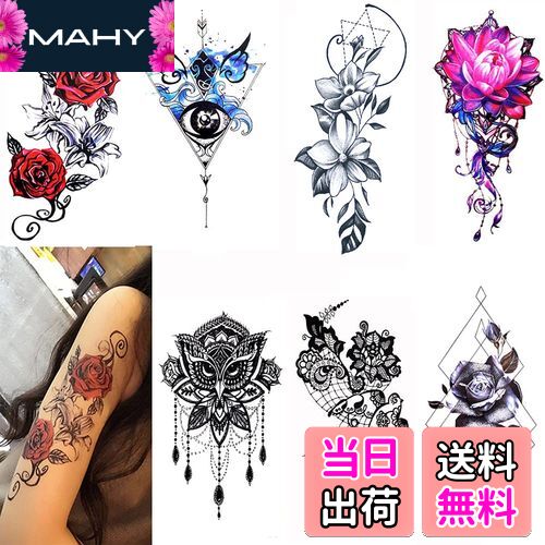 [商品説明]商品情報商品の説明主な仕様 【セット内容】 腕 タトゥーシール 7枚セット、7種類、各1枚。赤 薔薇 タトゥー 、赤 蓮の花、黒 レー スデザイン、黒 バラ 花。br【サイズ】:約11.5cm×21cm(絵柄台紙部分)。br【持ち時間】防水加工のため、お風呂など通常は4-7日程度保つ事が出来ます。 手足等のよく動かす所と間接部分は1,2日程度が目安です。br【材質】:ポリエステル 高品質の紙 、裏面:EVA樹脂 接着剤。br【貼るだけ簡単】 腕や足、体や背中等、お好きな場所に。