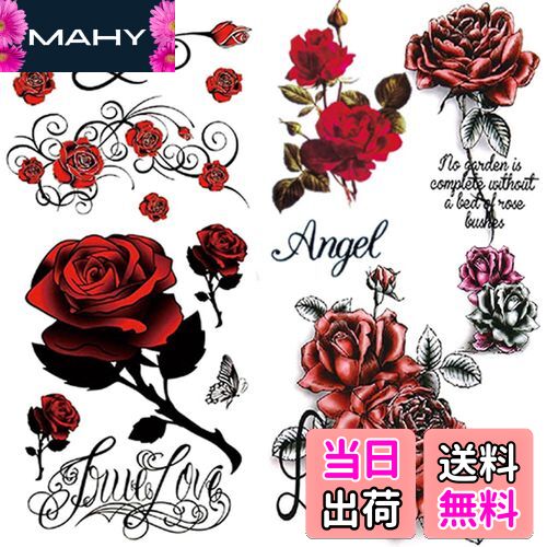 [商品説明]商品情報商品の説明主な仕様 【セット内容】タトゥーシール 薔薇 赤 黒 8枚セット、大柄2種類各3枚、小柄2枚。br【サイズ】:約9cm×19cm(絵柄台紙部分)、小柄:約6cm×10.5cm(絵柄台紙部分)。br【持ち時間】防水加工のため、お風呂など通常は4-7日程度保つ事が出来ます。 手足等のよく動かす所と間接部分は1,2日程度が目安です。br【材質】:ポリエステル 高品質の紙 、裏面:EVA樹脂 接着剤。br【貼るだけ簡単】 腕や足、体や背中等、お好きな場所に。