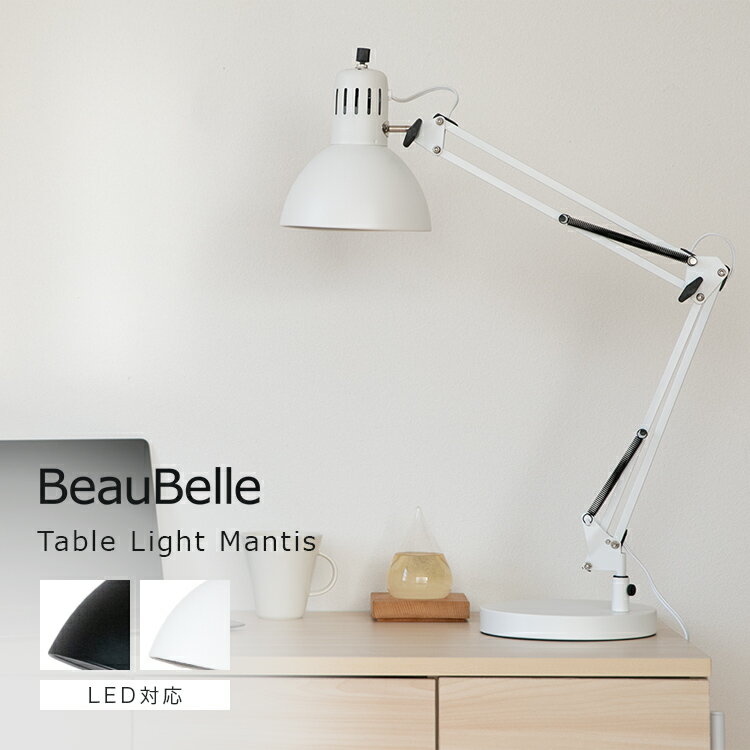 [商品説明]DETAILS シックなムードが魅力の「マンティス」。 古き良き時代を感じさせる、レトロな雰囲気がお洒落なデスクライトです。 情緒あるデザインは消灯時にもお部屋のインテリアとして活躍してくれます。 商品サイズ 本体サイズ/高さ 最長900~最短430(mm) シェードサイズ/直径171×高さ167(mm) ベースサイズ/直径198×高さ25(mm) 重量 3.1(kg) 材質 スチール カラー ブラック / ホワイト 仕様 口金/E26 60W×1まで対応(電球付属なし) ON・OFFロータリースイッチ付き テーブル取り付け用クランプ付き(テーブル厚さ53mmまで対応) 注意事項 お買い物の際は、会社概要の「その他の注意点」を必ずご確認ください。 変更情報 サイズと重量とデザインを変更しました。 2025年3月20日:本体サイズ(高さ):最長970~最短350(mm)→最長900~最短430(mm) 2025年3月20日:シェードサイズ:直径150×高さ170(mm)→直径171×高さ167(mm) 2025年3月20日:ベースサイズ:直径190×高さ25(mm)→直径198×高さ25(mm) 2025年3月20日:コードの長さ:2220(mm)→1600(mm) 2025年3月20日:重量:5(kg)→ 3.1(kg) 2025年3月20日:デザイン:シェードとベースの形変更。 2025年3月20日:商品番号がbbf-034からbbf-073に変更。 商品紹介 POINT1 フレキシブルな動き ヘッドとアーム部分を自由に角度調整できるため 灯りが欲しい場所をスムーズに照らすことができます。 POINT2 フロアライトとしても フロアライトとして使用できるように 高さを最長90cm~最短43cmまで調整できます。 ベース部分も頑丈な構造なので、 安定感も抜群です。 POINT3 消灯時には、お洒落なインテリアに ベーシックかつスタイリッシュな洗練された佇まいのマンティス。 消灯時はインテリアの主役のような存在感を放ちます。 POINT4 付属のクランプで作業スペースを確保 作業スペースを狭めずに灯りを照らしたい人は 付属のクランプを使用した設置をおすすめします。