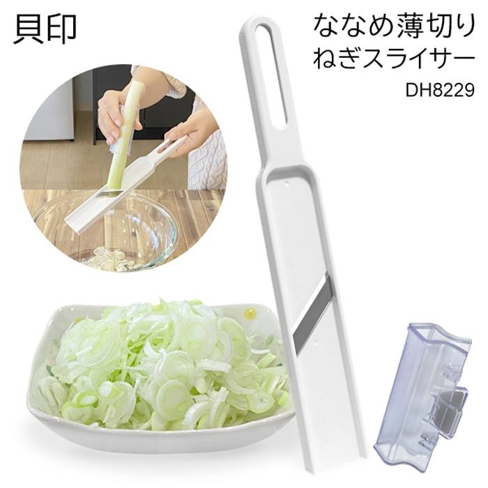 [商品説明]▼ 貝印 ななめ薄切りねぎスライサー スムーズに長ねぎをどっさりスライスできる! 指ガード付きで安心♪日本製スライサー。 長ねぎをどっさりスライスできる! 指ガード付きの日本製ねぎスライサーです。 角度によって、「ななめ薄切り」と「小口切り」の2通りのスライスが可能。 まな板いらずで片付けがラクに! ねぎしゃぶ・ねぎラーメンなど、さまざまな料理にたっぷり使えて便利! しっかり切れるので、料理初心者の方でも上手にスライス! 指を守る指ガードつき。 指ガードは、収納時にスライサーの刃カバーにもなるので安全です。 食洗機・食器乾燥機に対応しているので、お手入れ簡単! ▼ 商品仕様 材質 刃部:ステンレス刃物鋼 本体:ABS樹脂(耐熱温度100度) 指ガード:ABS樹脂(耐熱温度100度) 樹脂バネ(耐熱温度150度) 本体サイズ 268×38×40mm 重量 65g メーカー 貝印 生産国 日本製 ※ 食材や食器は一切付属しません。 ・ 掲載画像はイメージであり、実際の製品とは多少異なる場合があります。 ・ パッケージや個装形態は入荷時期によって変更となる場合があります。 ・ 製品の仕様は品質の向上・改善のため、予告なく変更となる場合があります。