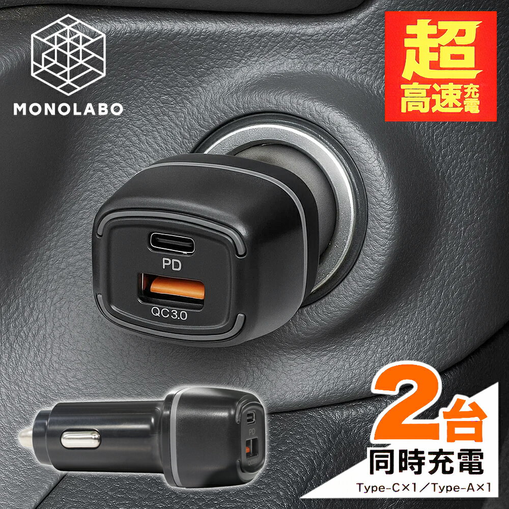 [商品説明]超高速充電シガーソケットUSBチャージャー 車内でスマホを高速充電!2ポート搭載で2台同時充電☆ 車内でスマホやタブレット、ゲーム機を効率的に充電! 12V/24V車対応の超高速USBチャージャー! 2台同時充電も可能です。 暗い車内でも視認できるLEDライト付きで、使いやすさも抜群! ■ 2台同時充電対応 Type-Cポート×1(最大30W) Type-Aポート×1(最大18W) 合計最大48W ■ 超高速充電 約3300mAhのスマートフォンを 30分で57% 1時間で87%まで充電可能 (0%からType-C使用時)(メーカー調べ) ■ LED点灯 通電時に青色LEDが発光します。 暗い車内でも見やすい♪ ■ コンパクト設計 本体サイズ約W3.5×D7.2×H2.8cmで邪魔にならないサイズ。 シガーソケットに差すだけ。 ■ 幅広い対応 12V/24V車対応。 スマホ・タブレット・ゲーム機・パソコンなど各種デバイスの充電に最適です。 ■ こんな方におすすめ 移動中にスマホやタブレットをしっかり充電したい方 長距離ドライブでナビや音楽再生中のデバイス充電に困っている方 出張や移動中に複数デバイスを同時に充電したいビジネスマン コンパクトながら高速充電対応で2台同時充電可能。 スリムタイプなので、シガーソケット周りやオーディオ周りもスッキリ! 邪魔にもなりません。 ドライブや旅行、出張、通勤に。 普段お仕事で車を使う方にも◎ 車内での充電ストレスを解消し、ドライブや移動をより快適に。 充電切れの不安をなくしましょう! ■ 商品仕様 ■ 本体サイズ 約W3.5×D7.2×H2.8cm 本体重量 約20g パッケージサイズ 約W9.0×D3.0×H16.5cm 電源 Type-C(PD3.0):DC5V 3A DC9V 3A DC12V 2.5A(最大30W) Type-A(QC3.0):DC3.6~6.5 3A DC6.5~9V 2A DC9~12V 1.5A(最大18W) 出力 最大48W (Type-CとType-A同時使用時) 材質 ABS、鉄 ※ 定められた電源電圧で使用してください。 ※ 急速充電は、使用するケーブルや充電する機器が急速充電に対応している必要があります。 ※ 充電・給電に必要なケーブルは付属しておりません。別途ご用意ください。 ・ 掲載画像はイメージであり、実際の製品とは多少異なる場合があります。 ・ パッケージや個装形態は入荷時期によって変更となる場合があります。 ・ 製品の仕様は品質の向上・改善のため、予告なく変更となる場合があります。