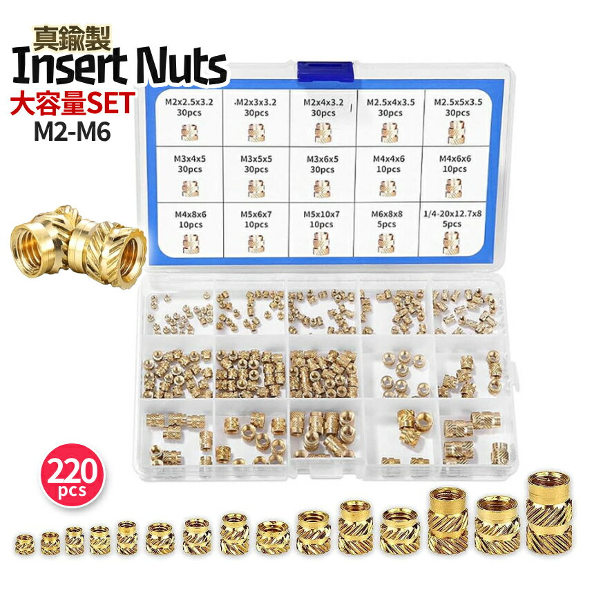 インサートナット 220pcs 大容量セット ねじ込みナット 真鍮製 ボ