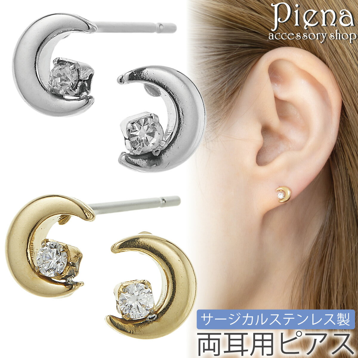 [商品名称]ピアス つけっぱなし 小さめ レディース サージカルステンレス 三日月 ムーン 月型 一石 一粒 ワンストーン ミニ シンプル お肌に優しい 金属アレルギー対応 金アレ かわいい 誕生日 記念日 プレゼント ギフト メール便送料無料