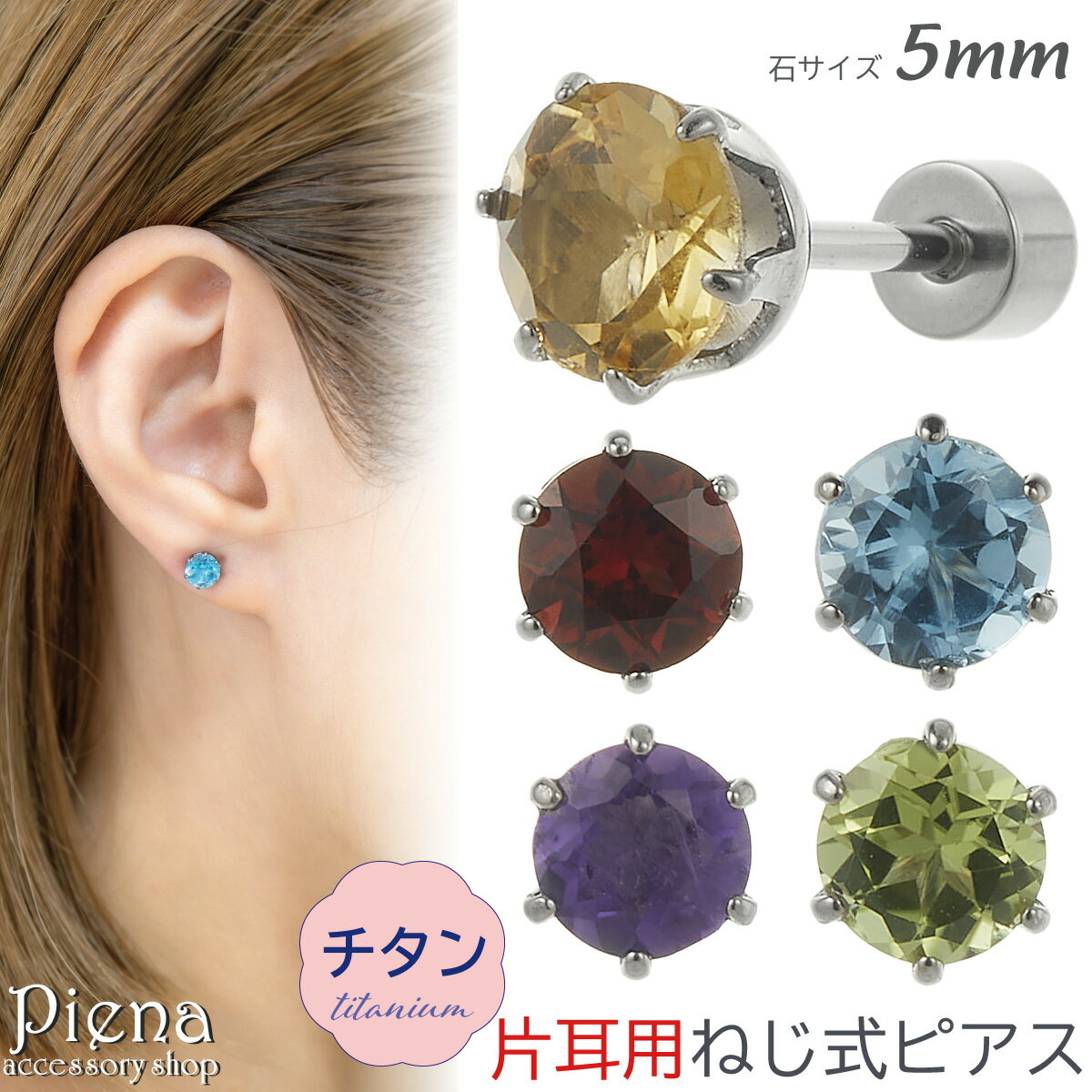 [商品名称]ピアス つけっぱなし チタン製 天然石 片耳用 1個売り キャッチ ねじ式 20G 石サイズ 5mm ワンストーン 一石 一粒 裏面フラット 痛くなりにくい 外れにくい ミニ 小さめ お肌に優しい 金属アレルギー対応 シンプル プレゼント ギフト メール便送料無料