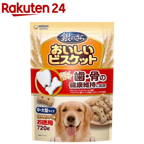 [商品説明]お店TOP>ペット用品>犬用食品(フード・おやつ)>犬用おやつ(間食・スナック)>犬用おやつ全部>銀のさら おいしいビスケット 歯・骨の健康 中・大型 ミルク・チキン・チーズ味 (720g)【銀のさら おいしいビスケット 歯・骨の健康 中・大型 ミルク・チキン・チーズ味の商品詳細】●ビタミン・ミネラルを配合●香ばしく焼き上げた、おいしいミルク・チキン・チーズ味●中・大型犬用サイズ:約40mm【使用方法】・1日の給与量は下記の表を目安に、愛犬の体重や健康状態にあわせて与えてください。・肥満の恐れがありますので、与え過ぎないように注意してください。・通常の食事の時間以外に与えてください。・新鮮な水をいつでも飲めるように用意してください。・幼犬には食べやすい大きさに割って与えてください。1日の給与量の目安愛犬の体重:1日の給与量10kg:3本/日まで20kg:5本/日まで30kg:7本/日まで40kg:8本/日まで50kg:10本/日まで【銀のさら おいしいビスケット 歯・骨の健康 中・大型 ミルク・チキン・チーズ味の原材料】穀類(小麦粉、コーンミール、フスマ)、でん粉類(コーンスターチ、でん粉)、油脂類、ショ糖、乳類(チーズパウダー、ミルクパウダー)、ビール酵母、大豆パウダー、チキンエキス、ミネラル類(カルシウム、銅、鉄、ヨウ素、マンガン、リン、セレン、亜鉛)、乳化剤、ヘキサメタリン酸ナトリウム、酸化防止剤(ミックストコフェロール)、ビタミン類(A、B1、B2、B6、B12、C、D、E、K、コリン、ナイアシン、パントテン酸、ビオチン、葉酸)【栄養成分】タンバク質:8.0%以上、脂質:10.0%以上、粗繊維:2.0%以下、粗灰分:5.0%以下、水分:10.0%以下、カロリー:約400kcal/100gあたり【注意事項】・おいしく食べられる賞味期限(常温で未開封の場合)をパッケージ裏面下部に記載してあります。・必要な栄養素は生物によって異なりますので、犬以外には与えないでください。・生後3ヶ月末の幼犬には与えないでください。まれに体調や体質に合わない場合もあります。何らかの異常に気付かれた時は給与を中断し、早めに獣医師に相談することをおすすめします。・高温多湿や直射日光を避け、風通しの良い場所に保管してください。・保管状態によっては、風味が落ちる場合がありますが、与えても差し支えありません。・開封後は、ほこりや虫が入らないよう封をしっかり閉じて衛生的に保管し、早めに与えてください。・食品、食器、おもちゃ、ペット用品等と区別し、小児の手の届かない場所に保管してください。・本品の空き袋をおもちゃにしないでください。【原産国】中国【ブランド】銀のさら おやつ【発売元、製造元、輸入元又は販売元】ユニ・チャーム ペットケアこちらの商品は、ペット用の商品です。リニューアルに伴い、パッケージ・内容等予告なく変更する場合がございます。予めご了承ください。(銀の皿 美味しいビスケット)ユニ・チャーム ペットケア東京都港区三田3-5-19住友不動産三田ガーデンタワー0120-810-539広告文責:楽天グループ株式会社電話:050-5577-5043[犬用品/ブランド:銀のさら おやつ/]