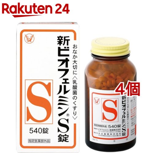 [商品説明]お店TOP>健康食品>医薬部外品>医薬部外品 目的別>整腸・軟便・便秘・腹部膨満の方に>新ビオフェルミンS錠 (540錠*4個セット)商品区分:医薬部外品【新ビオフェルミンS錠の商品詳細】●新ビオフェルミンS錠は、ヒト由来の乳酸菌を使用しているため定着性がよく優れた整腸効果を持っています。●バランスよく配合された3種乳酸菌(ビフィズス菌、フェーカリス菌、アシドフィルス菌)が生きたまま腸に届いて増え、整腸に役立ちます。●わずかに甘みがあり、小児から高齢者まで飲みやすい白色〜わずかに淡黄かっ色の錠剤です。【販売名】新ビオフェルミンS錠【効能 効果】整腸(便通を整える)、軟便、便秘、腹部膨満感【用法 用量】次の量を1日3回食後に服用してください。(年齢・・・1回量)15才以上・・・3錠5〜14才・・・2錠5才未満・・・服用しないこと★用法・用量に関連する注意(1)小児に服用させる場合には、保護者の指導監督のもとに服用させること(2)用法・用量を厳守すること(3)のどにつかえるといけないので、5歳未満の幼児には服用させないこと【成分】9錠(15歳以上の1日服用量)中コンク・ビフィズス菌末・・・18mgコンク・フェーカリス菌末・・・18mgコンク・アシドフィルス菌末・・・18mg添加物として、トウモロコシデンプン、デキストリン、乳糖水和物、沈降炭酸カルシウム、アメ粉、白糖、タルク、ステアリン酸マグネシウムを含有する。【注意事項】★使用上の注意<相談すること>1.次の人は服用前に医師または薬剤師に相談すること医師の治療を受けている人。2.次の場合は、直ちに服用を中止し、この文書をもって医師または薬剤師に相談すること1ヵ月位服用しても症状がよくならない場合【原産国】日本【ブランド】ビオフェルミン【発売元、製造元、輸入元又は販売元】大正製薬※説明文は単品の内容です。リニューアルに伴い、パッケージ・内容等予告なく変更する場合がございます。予めご了承ください。・単品JAN:4987306054790大正製薬170-8633 東京都豊島区高田3丁目24番1号03-3985-1800広告文責:楽天グループ株式会社電話:050-5577-5043[乳酸菌サプリメント/ブランド:ビオフェルミン/]