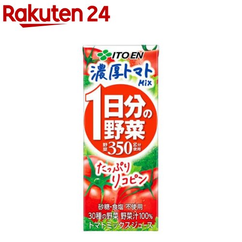 [商品説明]お店TOP>水・飲料>野菜ジュース・フルーツジュース>野菜ジュース>トマトジュース(食塩無添加)>伊藤園 1日分の野菜 濃厚トマトMIX たっぷりリコピン 紙パック (200ml×24本)【伊藤園 1日分の野菜 濃厚トマトMIX たっぷりリコピン 紙パックの商品詳細】●トマト4個分のリコピンが摂れる「1日分の野菜」※●30種の野菜が補える、野菜汁100%飲料です。●トマトをベースにセロリやパセリなどの香味野菜を使用し、濃厚かつ香り高い味わいが特長です。●厚生労働省が推奨する、1日の野菜摂取目標量350g分を使用しています。●野菜本来のおいしさを大切に、砂糖、食塩は一切使用していません。※トマト1個当たり90gとして、4個分のトマト汁を使用。【品名・名称】トマトミックスジュース【伊藤園 1日分の野菜 濃厚トマトMIX たっぷりリコピン 紙パックの原材料】トマトジュース(濃縮トマト還元)、野菜ジュース(セロリ(濃縮還元)、にんじん(濃縮還元)、パセリ、赤ピーマン(濃縮還元)、きゅうり(濃縮還元)、インゲン豆、大根(濃縮還元)、ピーマン(濃縮還元)、メキャベツの葉(濃縮還元)、ケール(濃縮還元)、レタス、アスパラガス(濃縮還元)、カリフラワー、グリーンピース、冬瓜、緑豆スプラウト(もやし)、ブロッコリー(濃縮還元)、ゴーヤ、ごぼう、セロリ、モロヘイヤ、かぼちゃ、ヤーコン、あしたば、小松菜、クレソン、キャベツ、ラディッシュ、ほうれん草、三つ葉)、レモン果汁/炭酸カリウム、ビタミンC、ビタミンE【栄養成分】1本(200ml)当たりエネルギー:60kcal、たんぱく質:2.7g、脂質:0g、炭水化物:13.0g(糖質:11.1g(糖類:8.5g)、食物繊維:0.9〜3.5g)、食塩相当量:0.04〜0.42g、亜鉛:0.0〜0.8mg、カリウム:643〜1210mg、カルシウム:19〜92mg、鉄:0.0〜2.2mg、マグネシウム:14〜66mg、ビタミンA:46〜400μg、ビタミンC:60〜310mg、ビタミンE:2.1〜7.9mg、ビタミンK:1〜70μg、葉酸:6〜120μg、β-カロテン:495〜4010μg、GABA:55mg、リコピン:18〜45mg【アレルギー物質】掲載なし【保存方法】直射日光や高温多湿の場所を避けてください。【原産国】日本【ブランド】1日分の野菜【発売元、製造元、輸入元又は販売元】伊藤園リニューアルに伴い、パッケージ・内容等予告なく変更する場合がございます。予めご了承ください。伊藤園151-8550 東京都渋谷区本町3-47-100800-100-1100広告文責:楽天グループ株式会社電話:050-5577-5043[野菜ジュース・フルーツジュース/ブランド:1日分の野菜/]