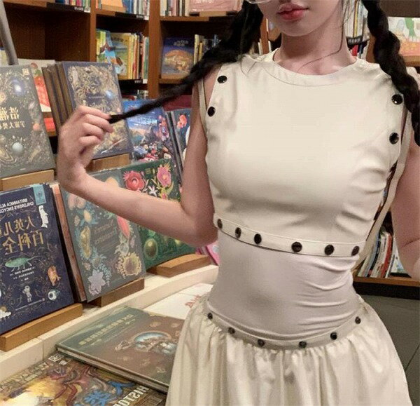 ソリッドカラー 2点セット ボタン スリム ロングスカート 袖なしベスト