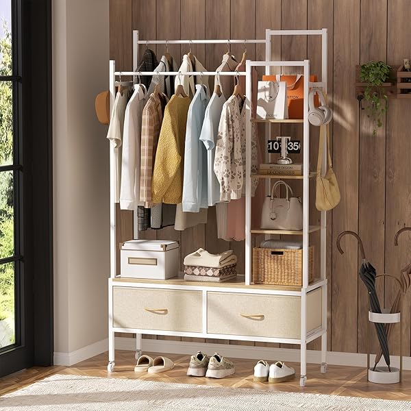 [商品名称]ハンガーラック 引き出し付き 2段 ヒキダシツキ キャスターツキ 洋服ラック ワードローブ 棚付き ダブル ロッド 多機能 キャスター付き コート掛け タンス 洋服掛け 収納付き 衣類収納 キャスター付き ハンガー 大容量 頑丈 wardrobe 全