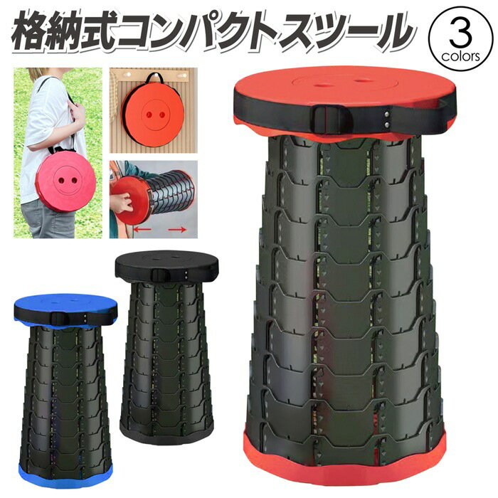 [商品説明]折りたたみ式 持ち手付き格納式コンパクトスツール 一瞬で広げてすぐに座れる!高さ調節可能&収納時はコンパクト! サッと引き出して瞬時にタフなスツールに変身! 高さを自由自在に調整できる格納式チェア。 縮めて片づければ持ち運びもラクラク! アコーディオンのように広げるだけで、全高約43.5cmのイスになります。 少しひねりを入れながらスツールの両端を引くだけでスツールが完成。 収納するときは逆方向に少しひねりを入れながら スツールの両端を押すだけで一瞬で収納。 高さを調節できるので、お好みのイスに変身♪ 体格・身長問わずみんなで使えます。 持ち手やショルダー紐もついているので、持ち運びラクラク♪ 収納時は厚みわずか6.5cm!携帯性バツグン! 釣り、お花見、キャンプ、花火大会、BBQ、ピクニック、野外フェス、運動会など様々なシーンに幅広く活躍。 お出かけのときにいつでも使えるようにマイカーに常備しておくのもオススメですよ☆ 災害時に避難所でも役立ちます。防災グッズとして1つは備えておきたいですね。 ■ 商品仕様 ■ 組み立て時サイズ 約W25×D25×H43.5cm 収納時サイズ 約W25×D25×H6.5cm 本体重量 約953g パッケージサイズ 約W25.5×D7.2×H26.3cm 耐荷重 約100kg ※ カラーはお選びいただけません。いずれかの色でのお届けとなります。ご了承の上、ご購入をお願い致します。 ※ 勢いよく座ったり、飛び乗ったりしないでください。 ※ 耐荷重の範囲内であっても、勢いよく座ったり物を落としたりすると破損・故障の原因となります。ご注意ください。 ※ 本商品を座るためのイスとしての用途以外で使用しないでください。上に乗って立って作業するなどの踏み台として使用しないでください。 ※ 座る前に、しっかり固定されているかどうか確認してください。パーツが噛みあっていないと、座ったときに伸縮して沈んでしまい大変危険です。 ・ 掲載画像はイメージであり、実際の製品とは多少異なる場合があります。 ・ パッケージや個装形態は入荷時期によって変更となる場合があります。 ・ 製品の仕様は品質の向上・改善のため、予告なく変更となる場合があります。