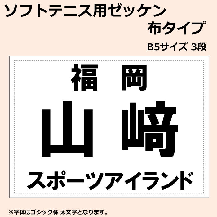 [商品説明]ソフトテニス用 ゼッケン ソフトテニスの試合には欠かせないゼッケンです。 日本ソフトテニス連盟の規定に沿ったゼッケンをお作りします。 【規定】 ・B5版 白の台布に黒文字で記入(ゴシック体 太文字) ・3段構成 上段:都道府県名・学連 中段:名前(苗字) 下段:所属名(企業名・クラブ・学校名) 【お願い】 ※購入時に必要事項を必ずご記入ください! ・記入方法1 購入時、備考欄に[上段・中段・下段]の情報をご記入ください。 (同じ苗字で名まで入れる場合は分かりやすくご記入ください) ・記入方法2 チームなどで注文数が多い場合は、購入後にお手数ですが当社にメールで[上段・中段・下段]の情報を記入してご連絡ください。 ※メールは[spv@ma-japan.net]←こちらにご連絡お願い致します。 【ゼッケンの詳細・注意】 ・ゼッケンは布タイプで縁は縫製されています。 ・布タイプなので繰り返し洗ってご使用できます。 ・昇華プリント ・3枚以上購入でメール便で送料無料!(日時指定はできません。) 通常宅配便をご希望の場合は通常宅配便の送料600円をいただきます。 <メール便をご希望の方はこちらをご確認ください。> ※システム上楽天より配信されるご注文受付メールには3枚購入しても送料が220円と表記される場合がございます。 その場合は、当店よりご注文確認後に送料を訂正し改めてメールにてご請求金額のご連絡を差し上げます。 ご迷惑をおかけしますがよろしくお願いします。 ※納期:2~5営業日で発送! ネーム加工につき、ご注文後の返品・交換・キャンセルはできません。