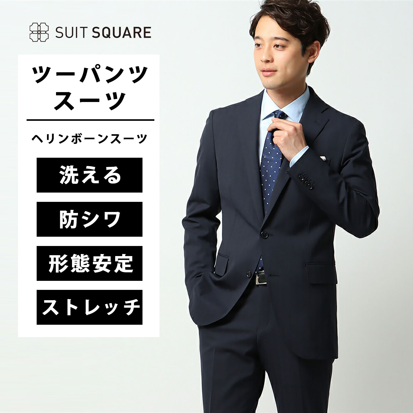 [商品名称]ツーパンツ スーツ メンズ スリム オールシーズン ネイビー 紺 ヘリンボーン 2ボタン 背抜き サイドベンツ テーパード ノータック 洗える ウォッシャブル 動きやすい ストレッチ 形態安定 シワになりにくい ビジネス 仕事 出張 通勤 営業 背広 紳士服