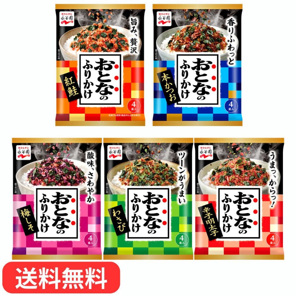 [商品名称]【食べ比べ】永谷園 おとなのふりかけ 4袋入 5種(紅鮭、本かつお、梅しそ、わさび、辛子明太子)