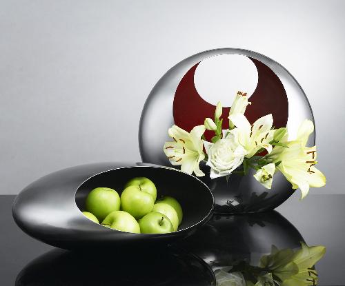 ミラー仕上げのステンレス18/10花入れ兼バスケットとフルーツボウルのお