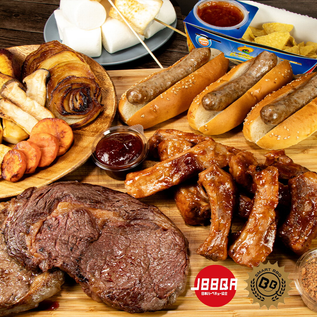 [商品名称]【送料無料】スマートバーベキューセット 日本バーベキュー協会公認商品 マシュマロ ナチョス チップス 野菜入り ステーキ 豚肉 バックリブ 牛肉 ソーセージ デザート - SET855