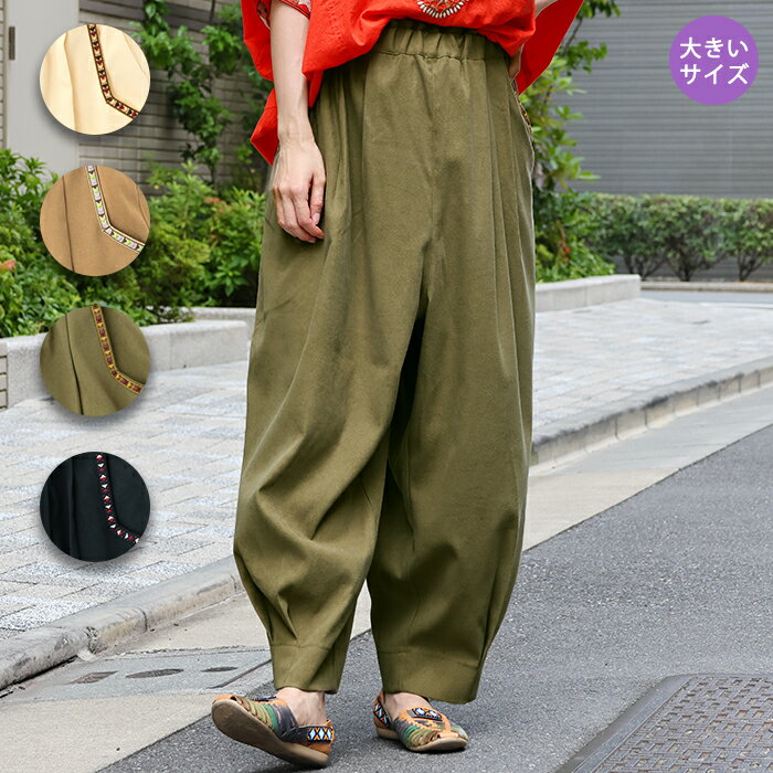 [商品名称]ピーチスキンエッグタックパンツ(大きいサイズ) / バルーンパンツ 男女兼用 秋冬 無地 ネイビー アイボリー ベージュ カーキ 3L サーカスパンツ ウエストゴム ズボン ボトムス レディース メンズ ユニセックス 15号 LL 大きめサイズ エスニック チチカカ TITICACA