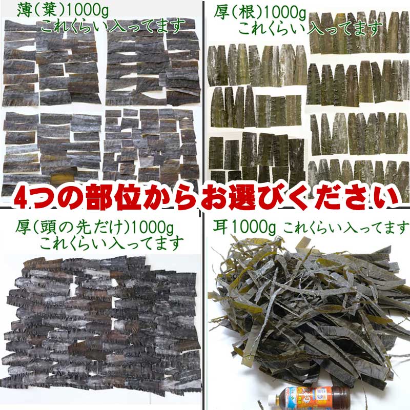 [キャッチコピー]真昆布でも北海道産の一等検・二等検のだし昆布です。頭・頭の先・葉・耳 4種類からお選びいただけます。