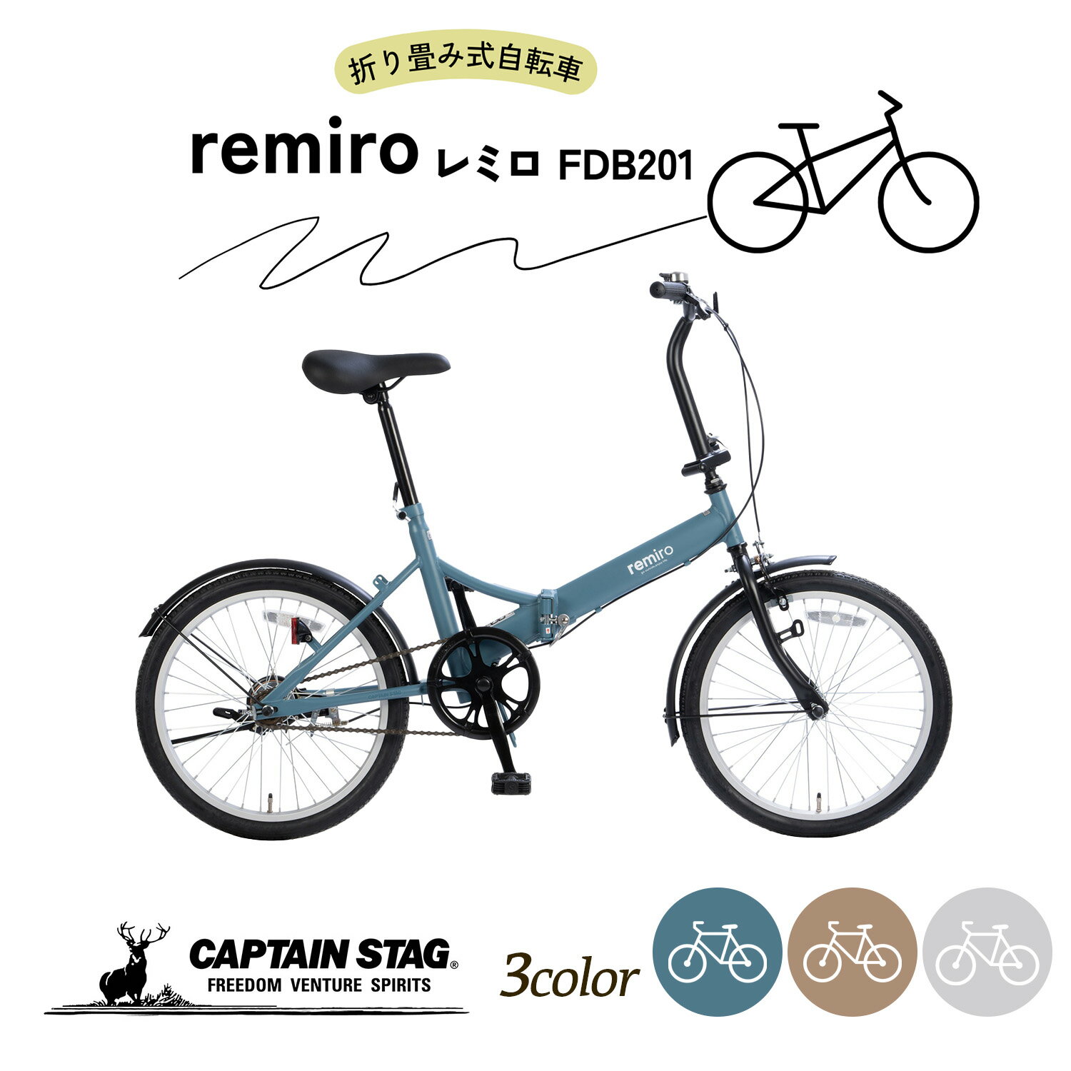 [キャッチコピー]キャプテンスタッグレミロシリーズの折り畳み式自転車。前後泥除け付き。かわいいカラー3色から選べる。