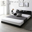 [商品名称]ベッド シングル 2層ポケットコイルマットレス付き ブラック 低床 LED 照明付き 棚付き 宮付き 宮棚付き 2口 コンセント付き すのこ ローベッド フロアベッド 低床ベッド すのこベッド すのこベット シングルベッド シングルベット